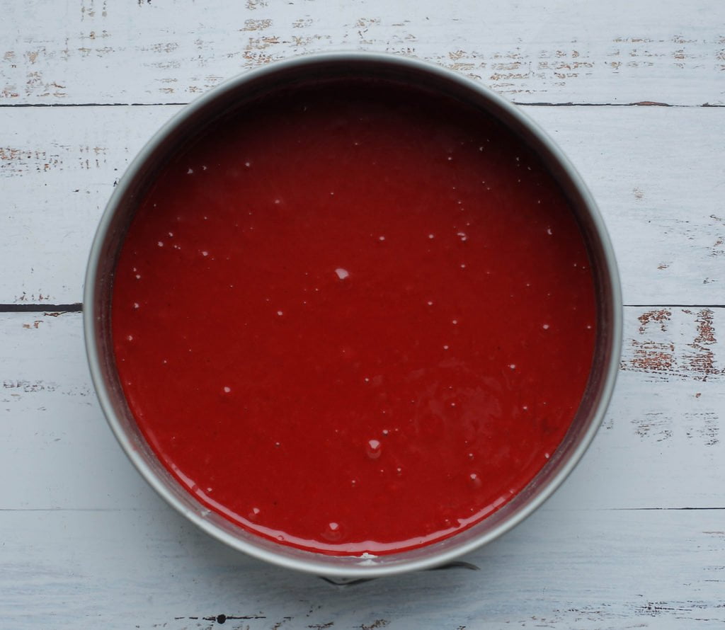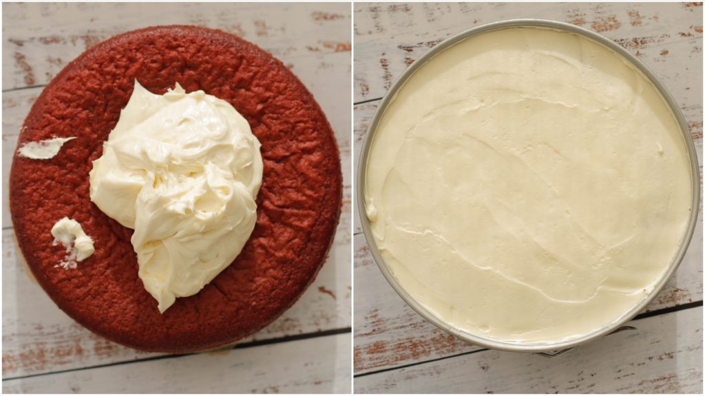 – Snijd een dun laagje weg van de onderkant van de cake om red velvet kruimels te maken.