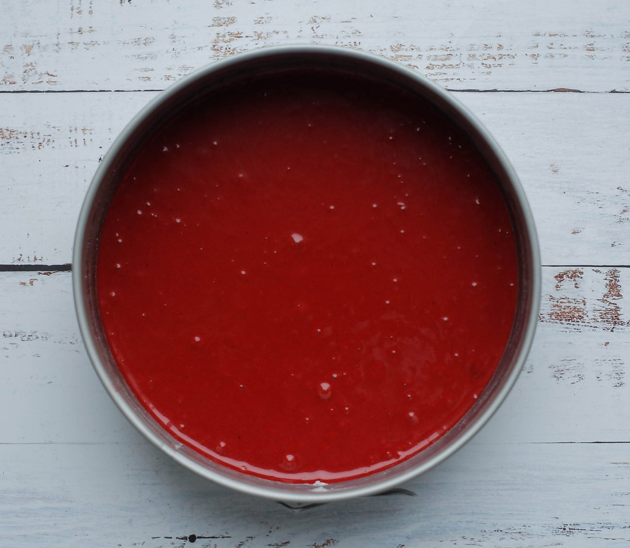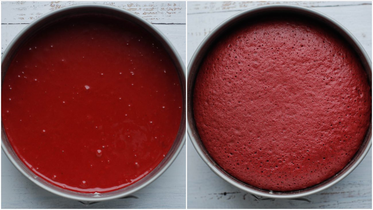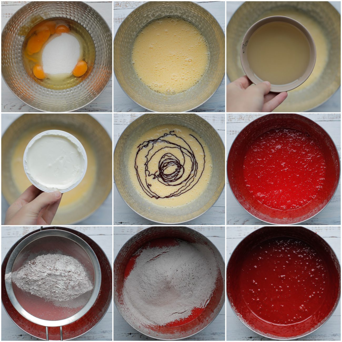 Doe de eieren samen met de witte basterdsuiker, vanillesuiker en het zout in een diepe kom. Mix in ca. 2 minuten luchtig. Voeg de zonnebloemolie, yoghurt en rode kleurstof gel toe. Mix voor een minuut. Zeef de bloem, cacaopoeder, bakpoeder en baking soda boven de mengkom. Mix alle ingrediënten samen tot een gladde beslag. |