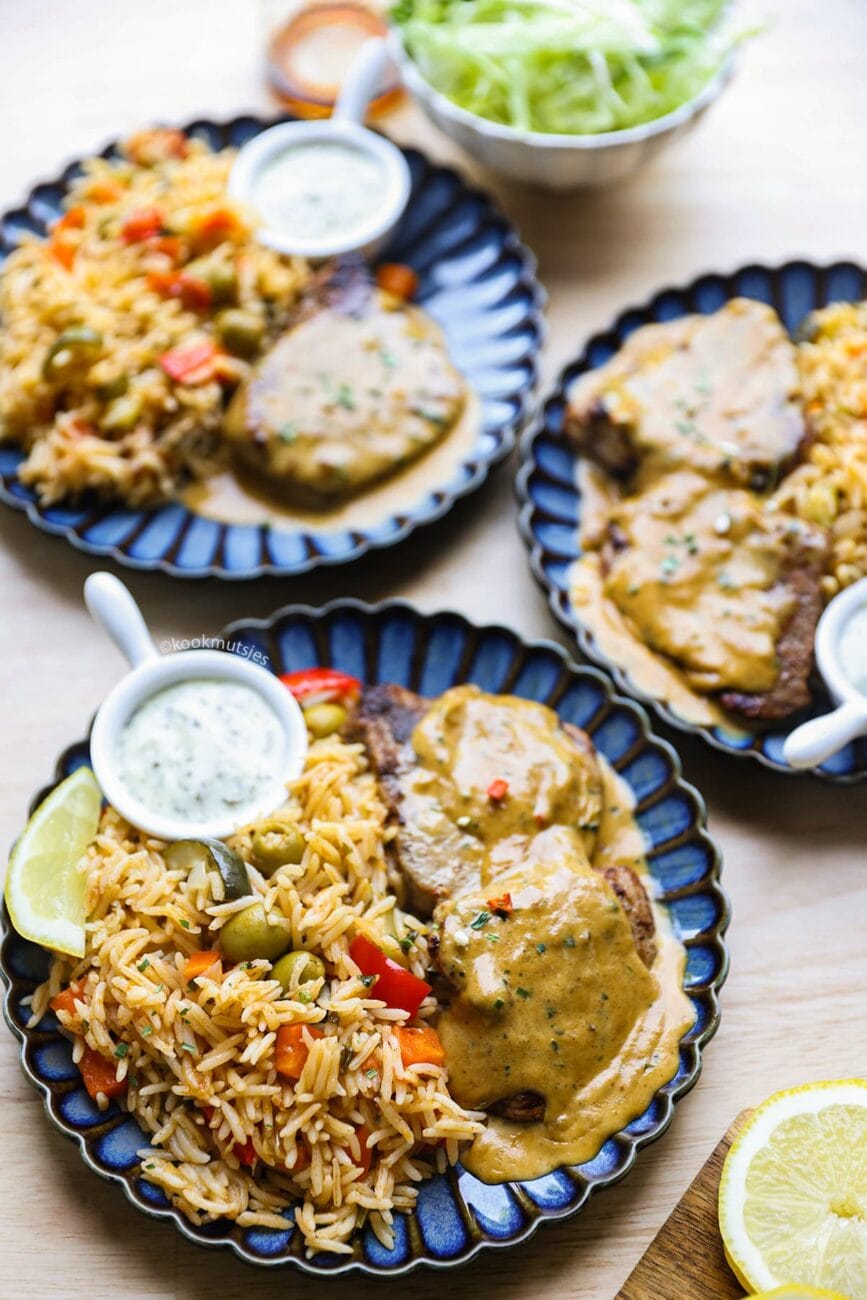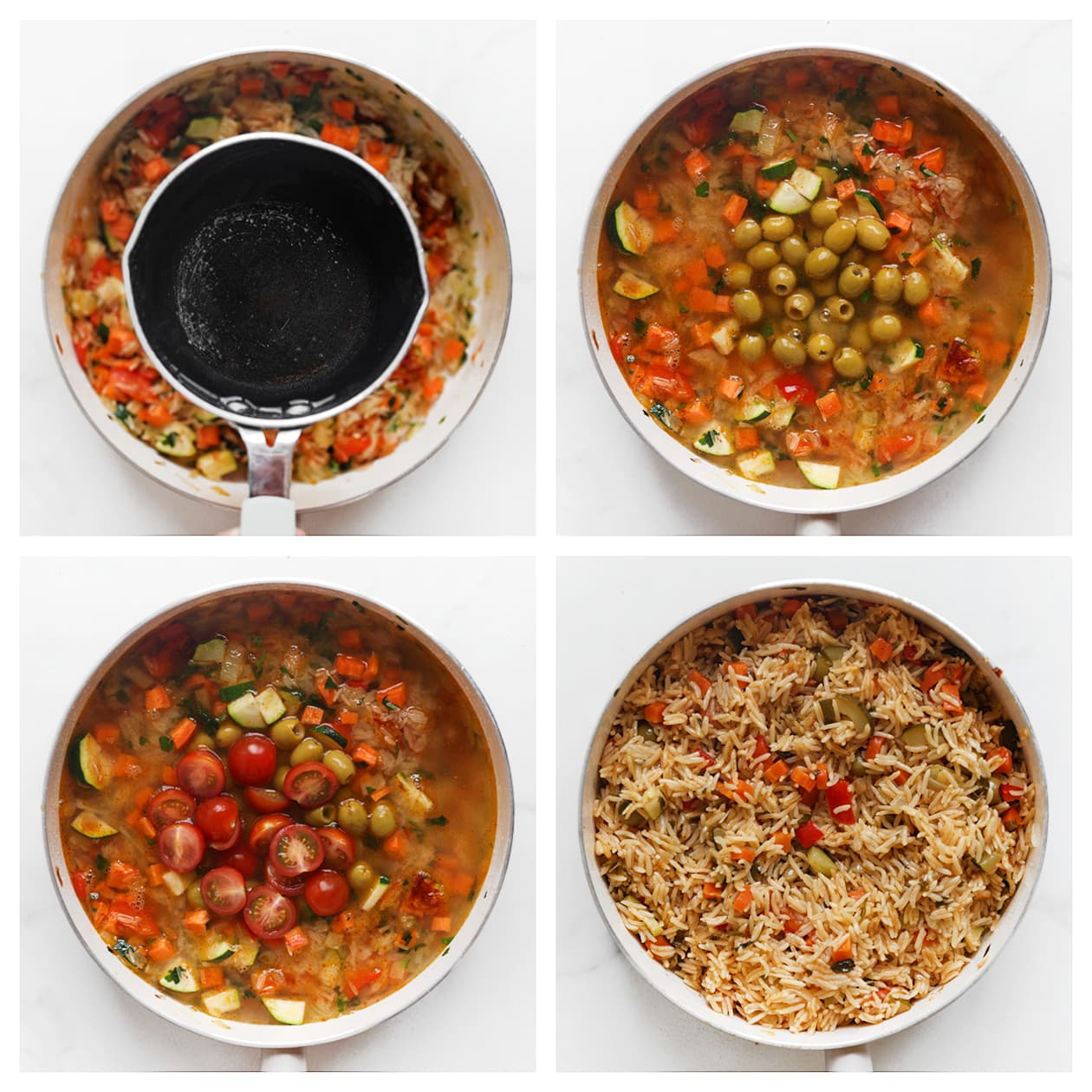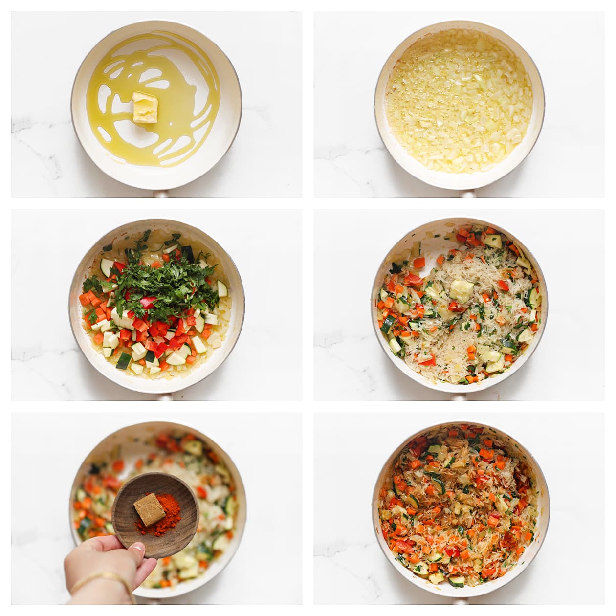 Heat the butter (25 g) and olive oil (35 ml) in a large sauté pan over medium heat. Add the onion and cook for 3–4 minutes. Then add the carrot, bell pepper, zucchini, parsley, and rice. Stir well. Crumble the stock cube over the mixture and add cayenne powder, black pepper, and salt. Cook for 2–3 minutes. |