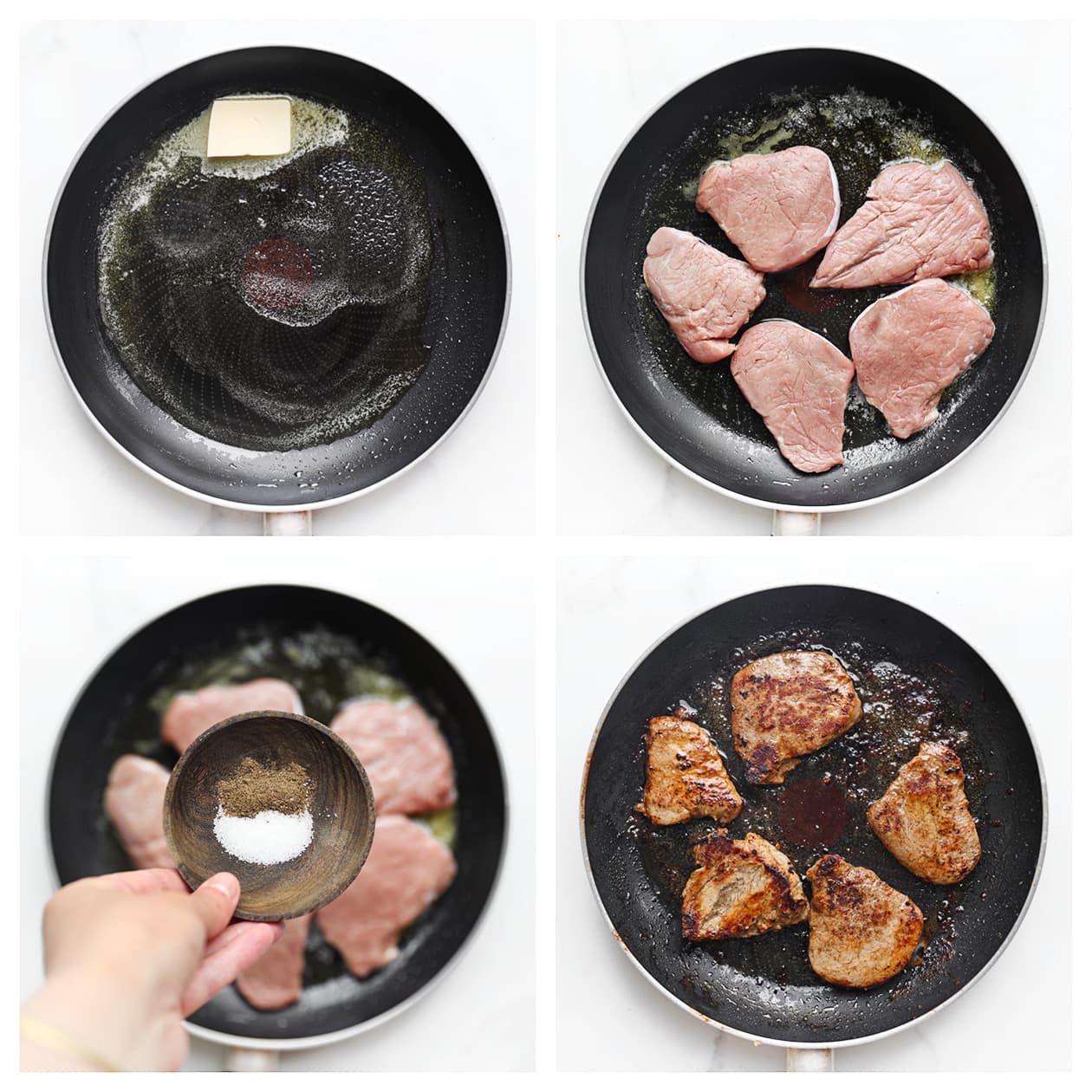 In a frying pan, heat the butter (40 g) and olive oil (20 ml) over medium heat. Place the beef tenderloin in the pan and season with salt and black pepper. Sear the meat for 1–2 minutes per side until a golden crust forms. While cooking, spoon the melted butter over the meat. Remove the meat from the pan and set aside. |