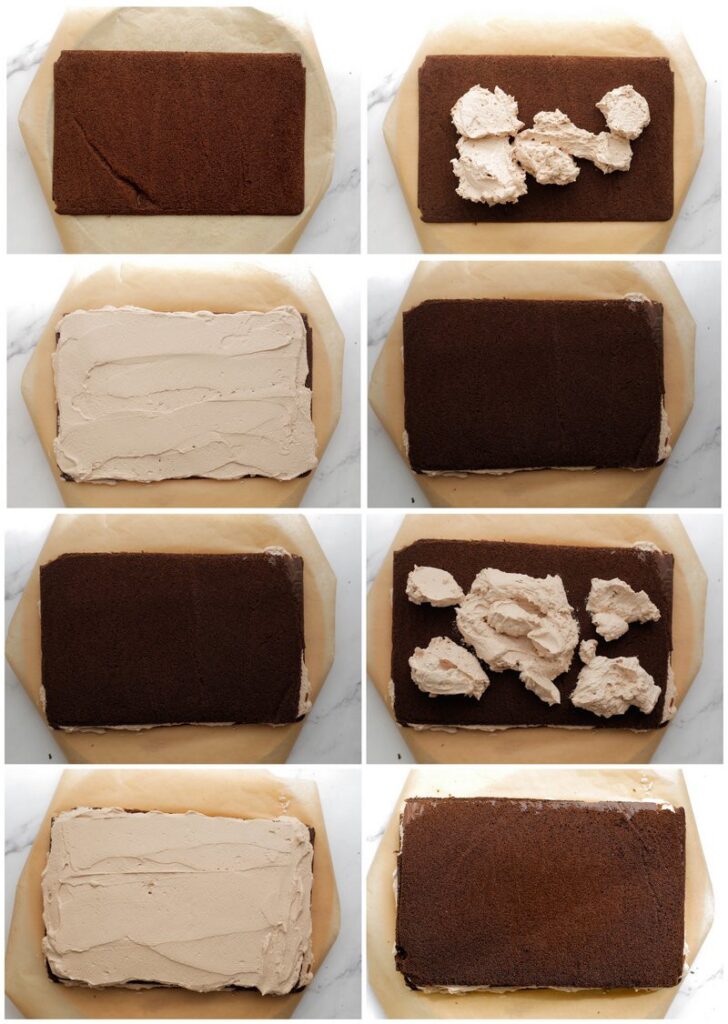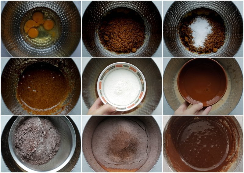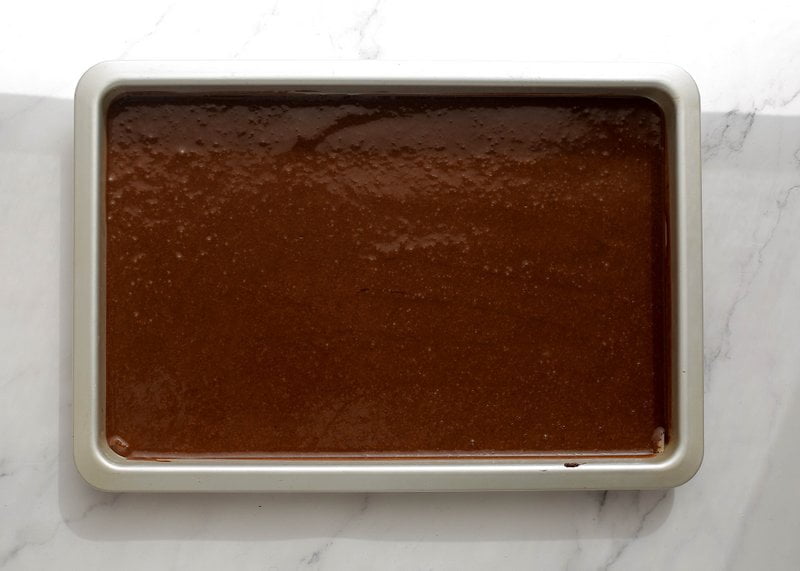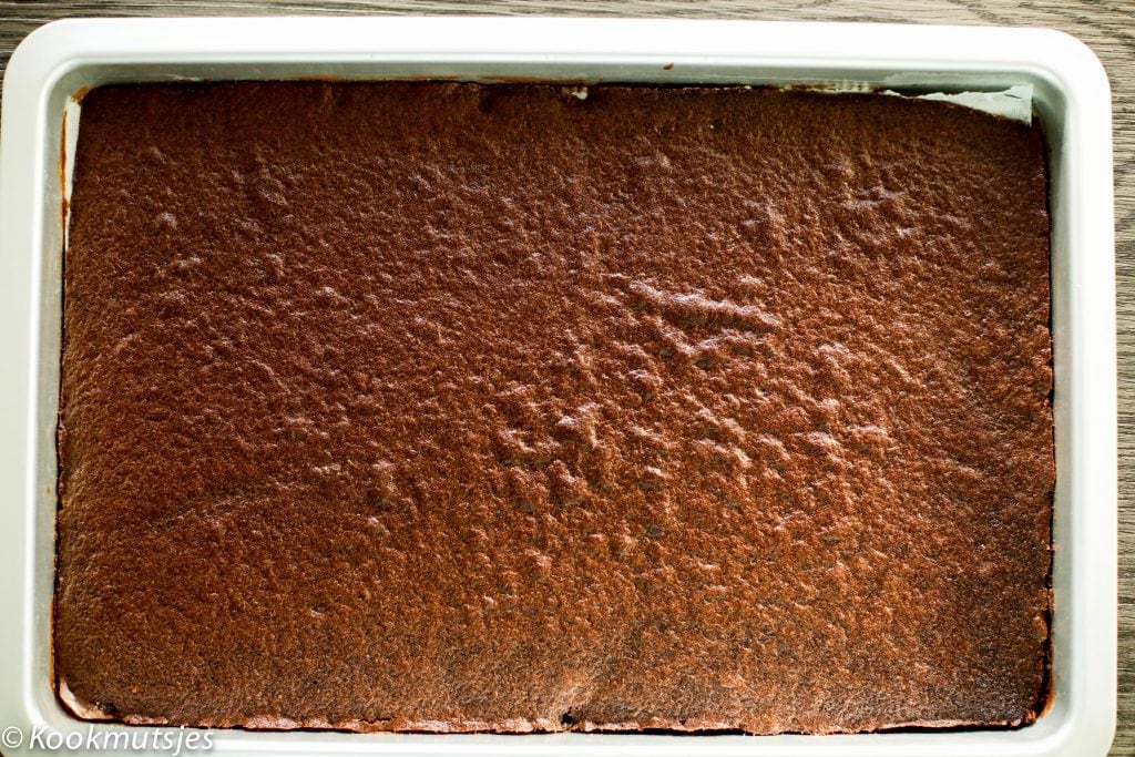 Leg de cake in een voorverwarmde oven op 175℃ voor 7 à 8 minuten. Prik er met een satéprikker in om te kijken of de cake gaar is. Wanneer de prikker er droog uitkomt, is de cake klaar. Herhaal deze stap met de volgende 2 cakes of gebruik 3 dezelfde bakvormen dan ben je gelijk klaar. Je kunt ook 1 cake maken en door 3 snijden (cake gaat wel langer de oven in). |
