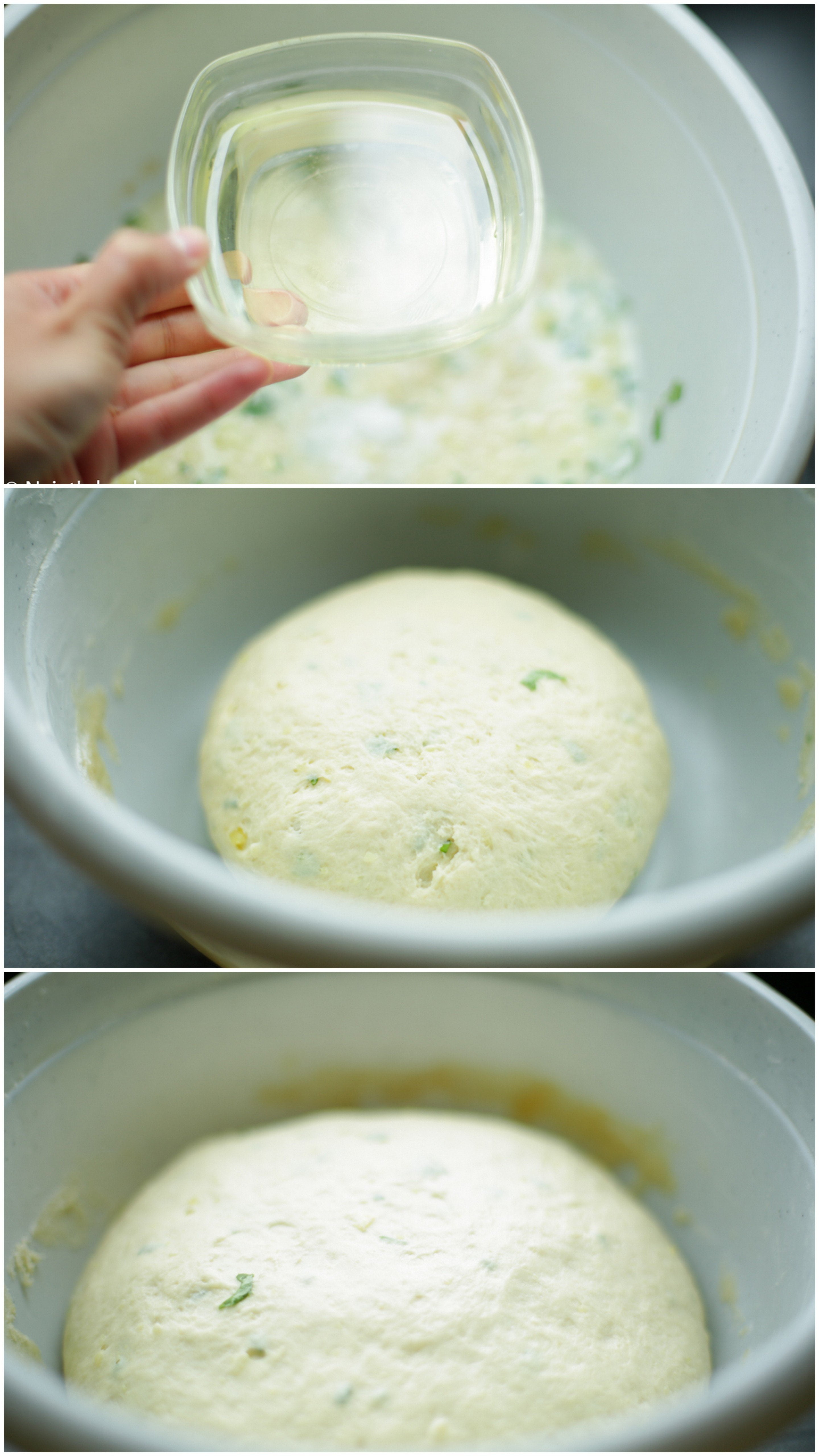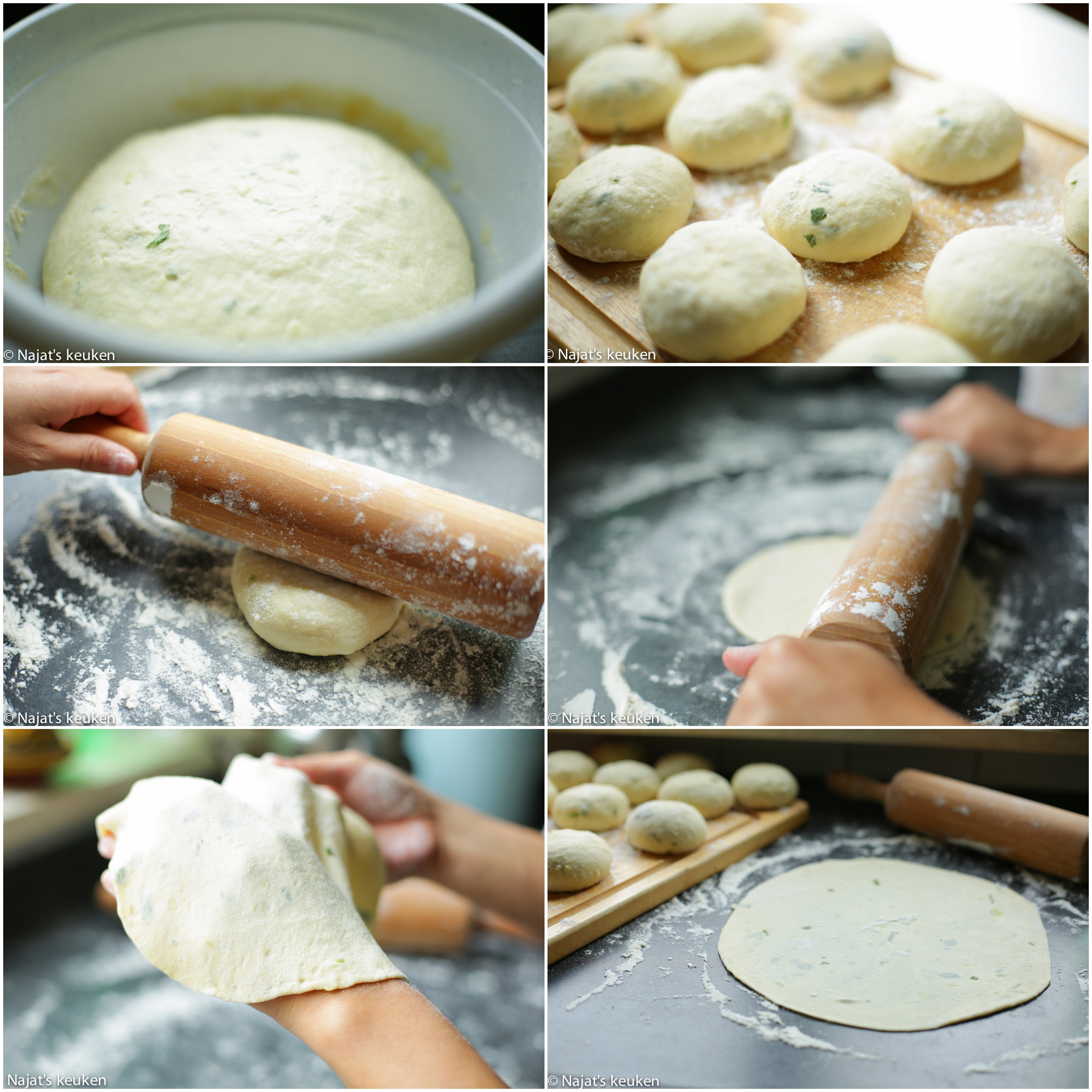 Het deeg hoort plakkerig te zijn, als je beginnend bent dan kan dit nogal afschrikken en daarom heb ik 50 gr extra bloem als tip meegegeven. Smeer je handen goed in met wat olie als je de extra olie toevoegt en kneed het dan goed samen. Straks stort je het op een bloem bestoven werkplek en dan valt het allemaal mee!