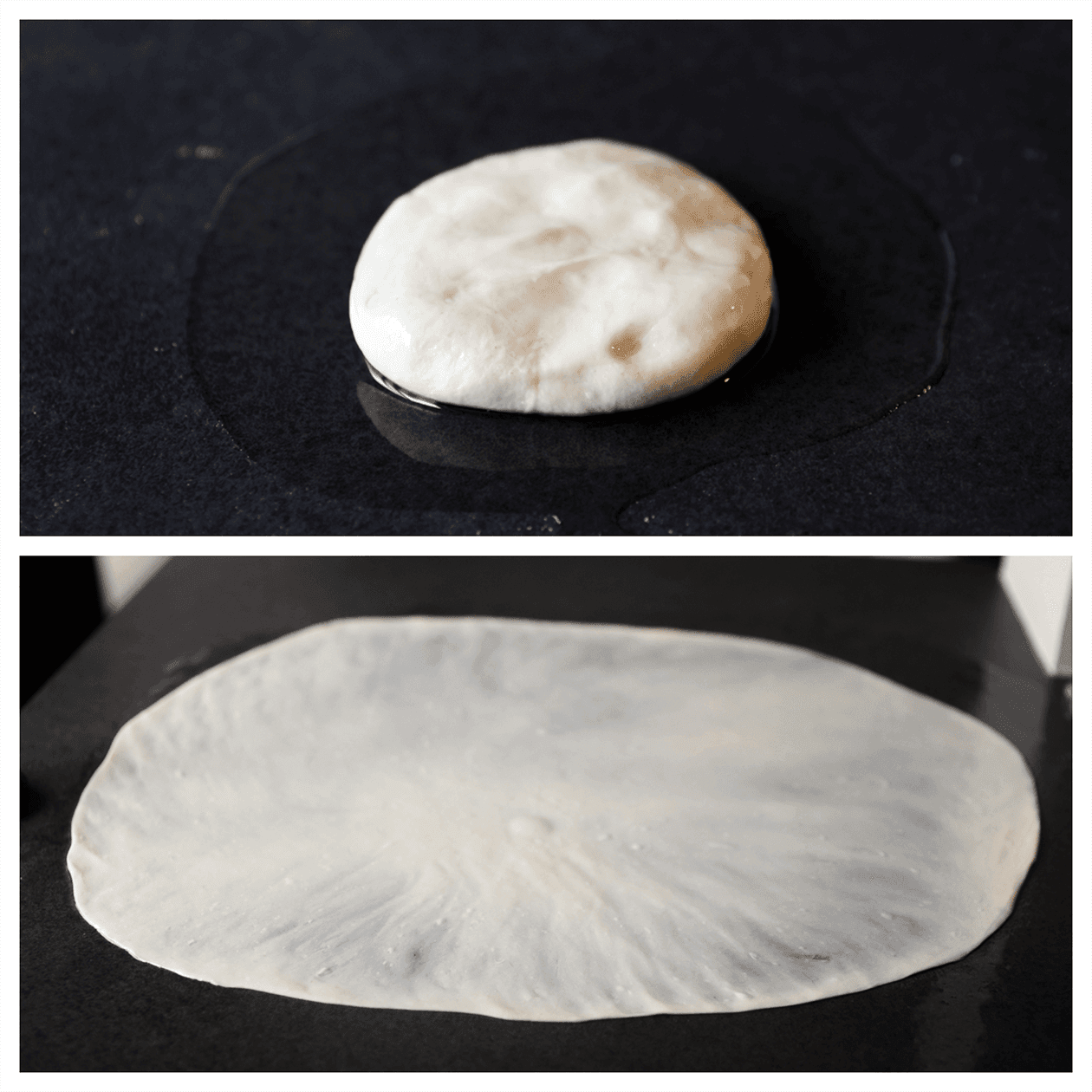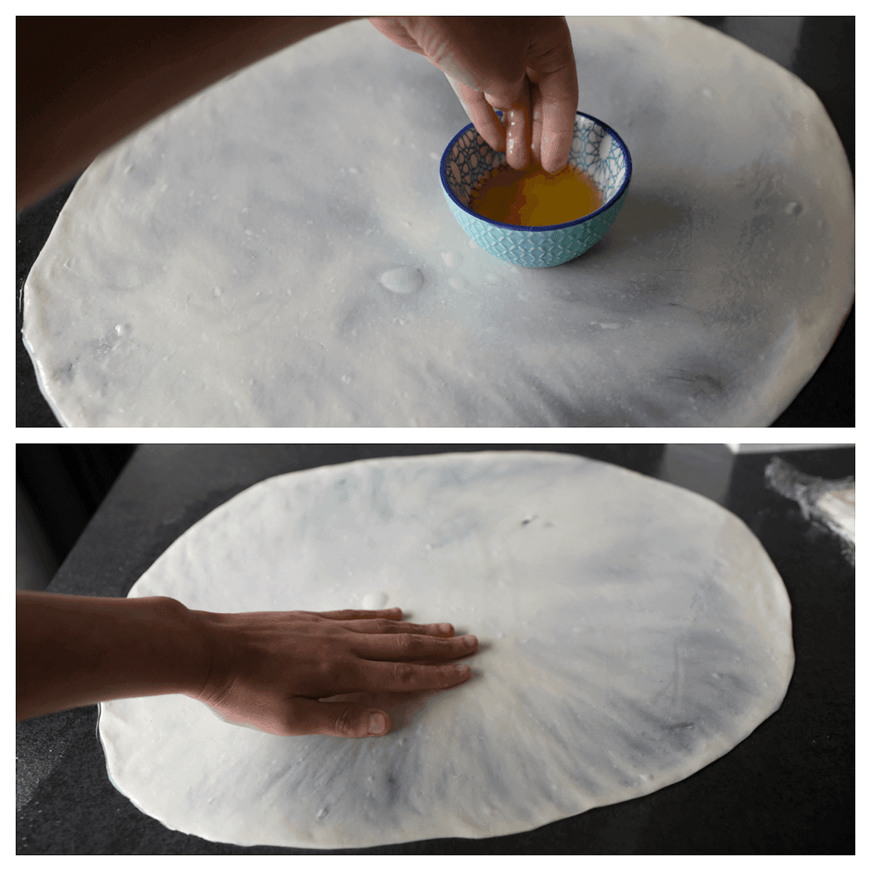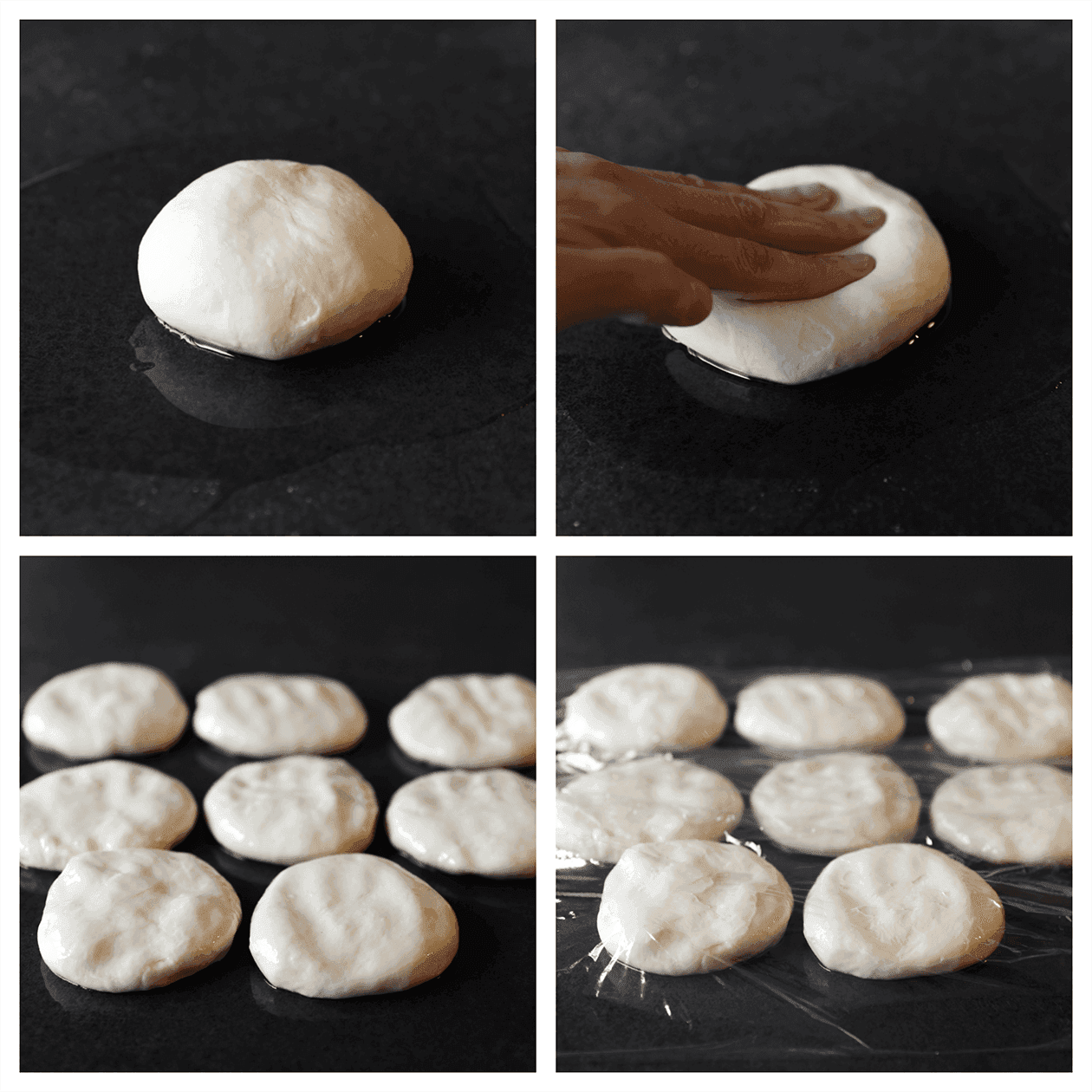 Verdeel wat zonnebloemolie over je werkplek (25 ml). Leg het bolletje deeg erop en druk iets plat. Herhaal deze stap. Dek af met huishoudfolie en laat 45-60 minuten staan.