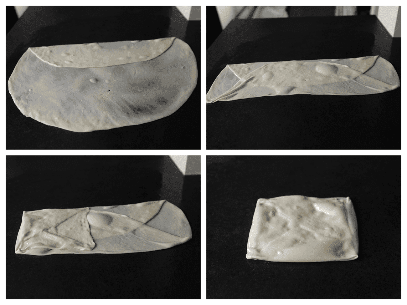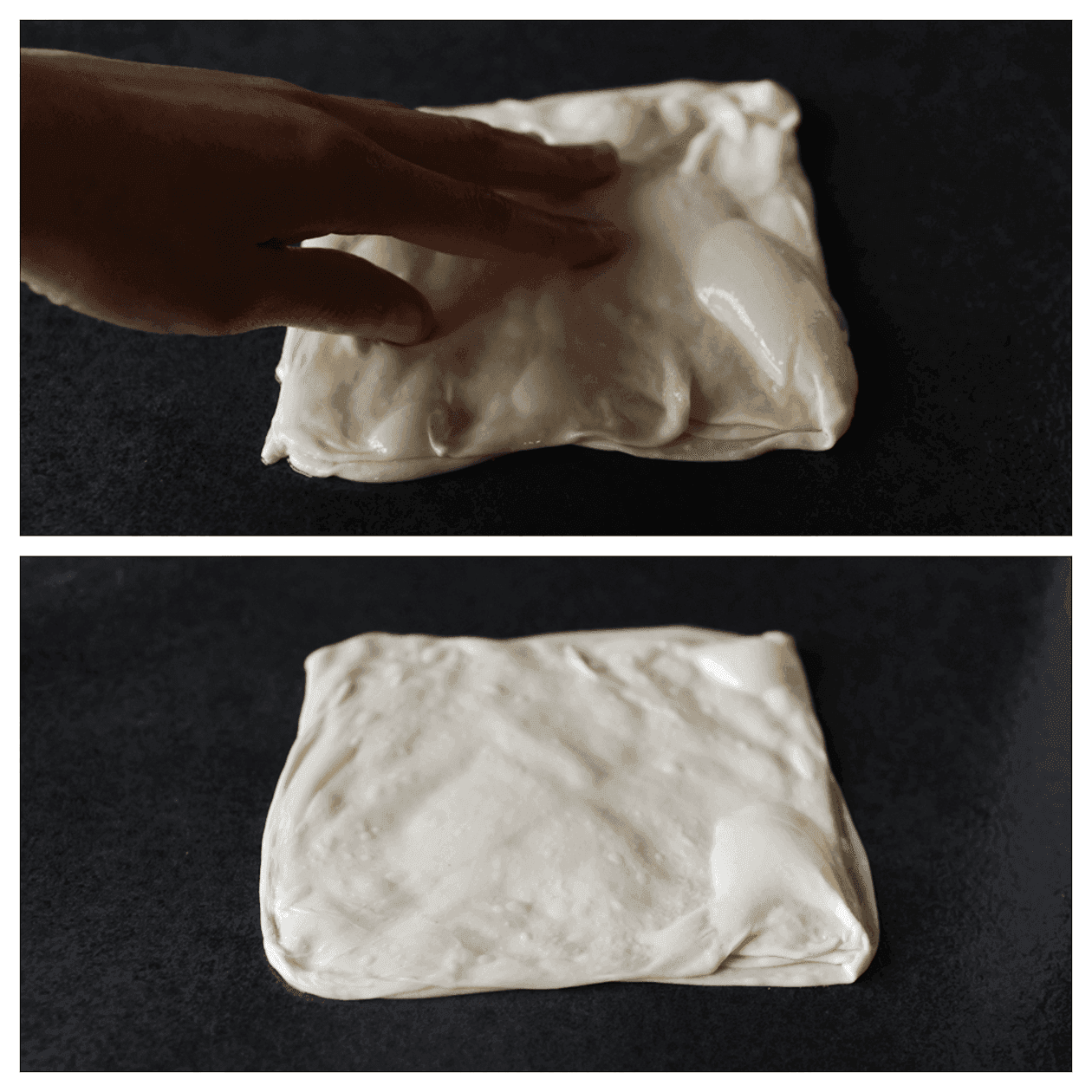Vouw het flinterdunne deeg naar binnen in vier delen. Vorm het deeg tot een vierkant pakketje van 15 cm. Strooi wat fijne griesmeel aan beide kanten van het deeg. Herhaal de werkwijze.