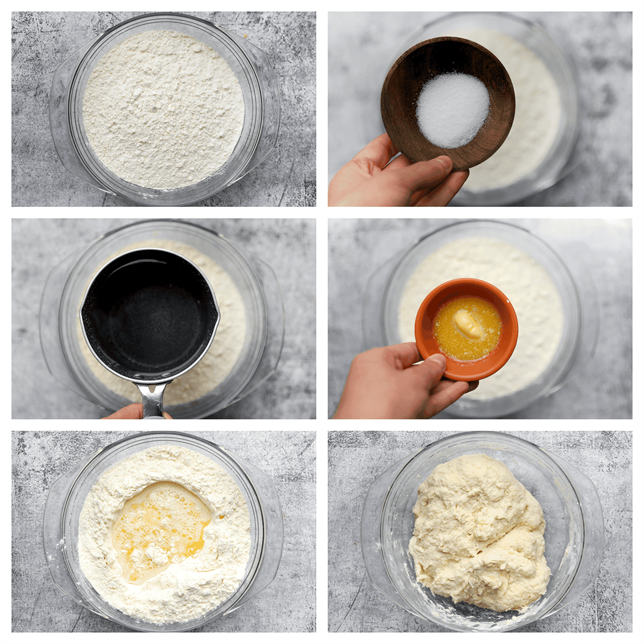 Doe de bloem, het zout en suiker in een kom. Maak een gat in het midden. Voeg de gesmolten roomboter en het water toe. Kneed 5 minuten.