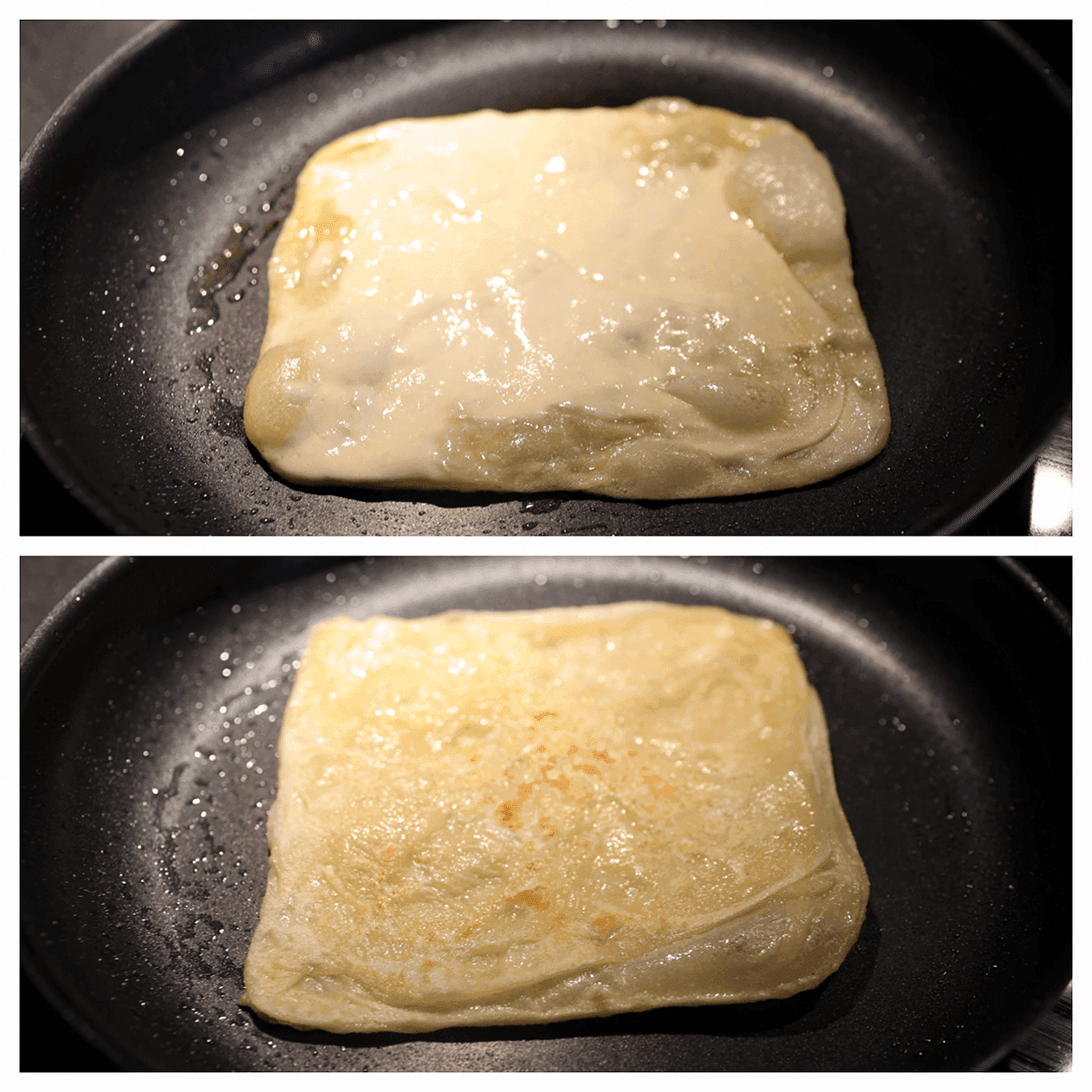 Verhit de koekenpan op middelhoog vuur. Begin met de eerste msmen die je hebt gevouwen (werk alleen op een ingevette werkplek). Vet je handen goed in en veeg met je vingertoppen het uiteinde plat om het formaat te verdubbelen (21 bij 20 cm).