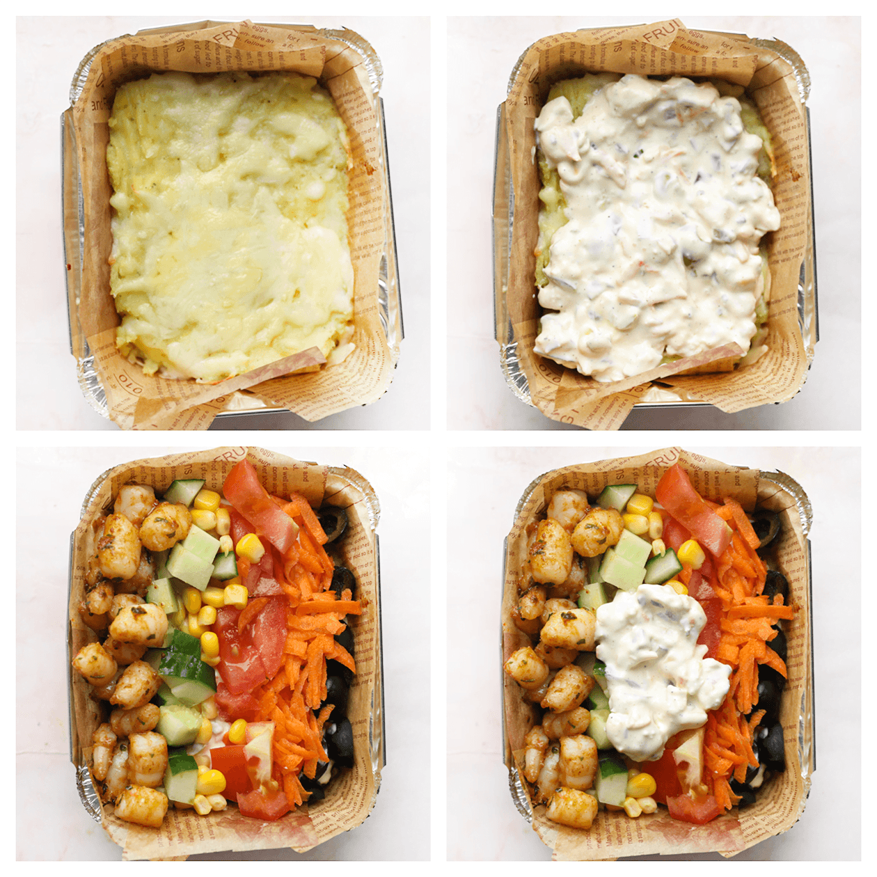 Haal de aardappelbakjes voorzichtig uit de oven. Verdeel er een laagje saus over. Schep er wat zwarte olijven, wortel, tomaat, maïs, wortel, garnalen en nog wat saus op. Geniet ervan!