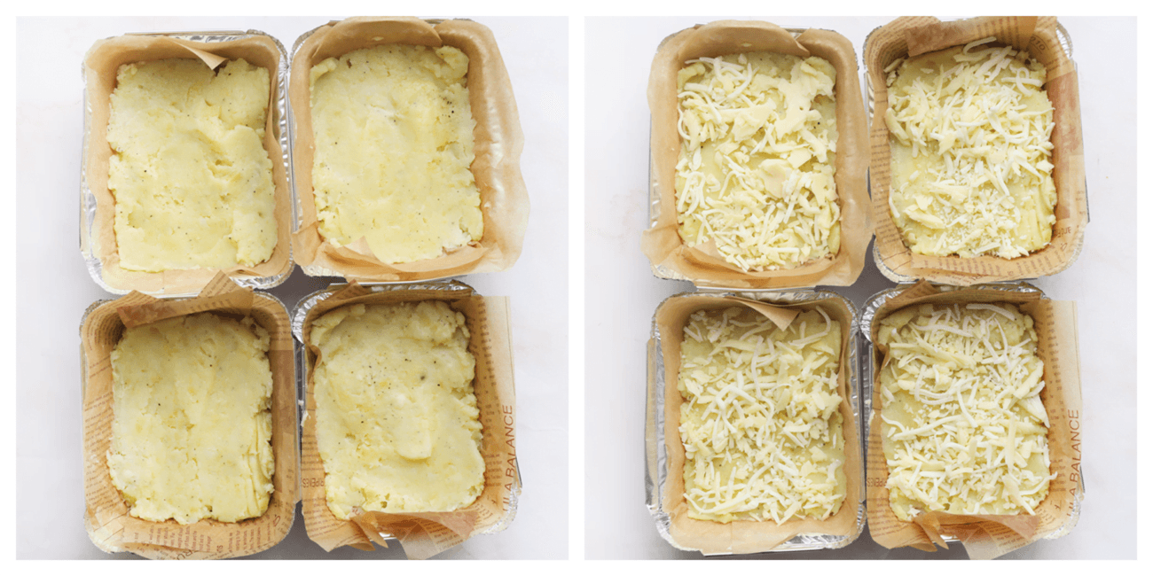 Verdeel een laagje aardappelpuree over een kom/bak. Strooi er wat geraspte kaas op. Zet het in een voorverwarmde oven op 200 ℃. Bak 5-8 minuten of tot de kaas volledig is gesmolten.