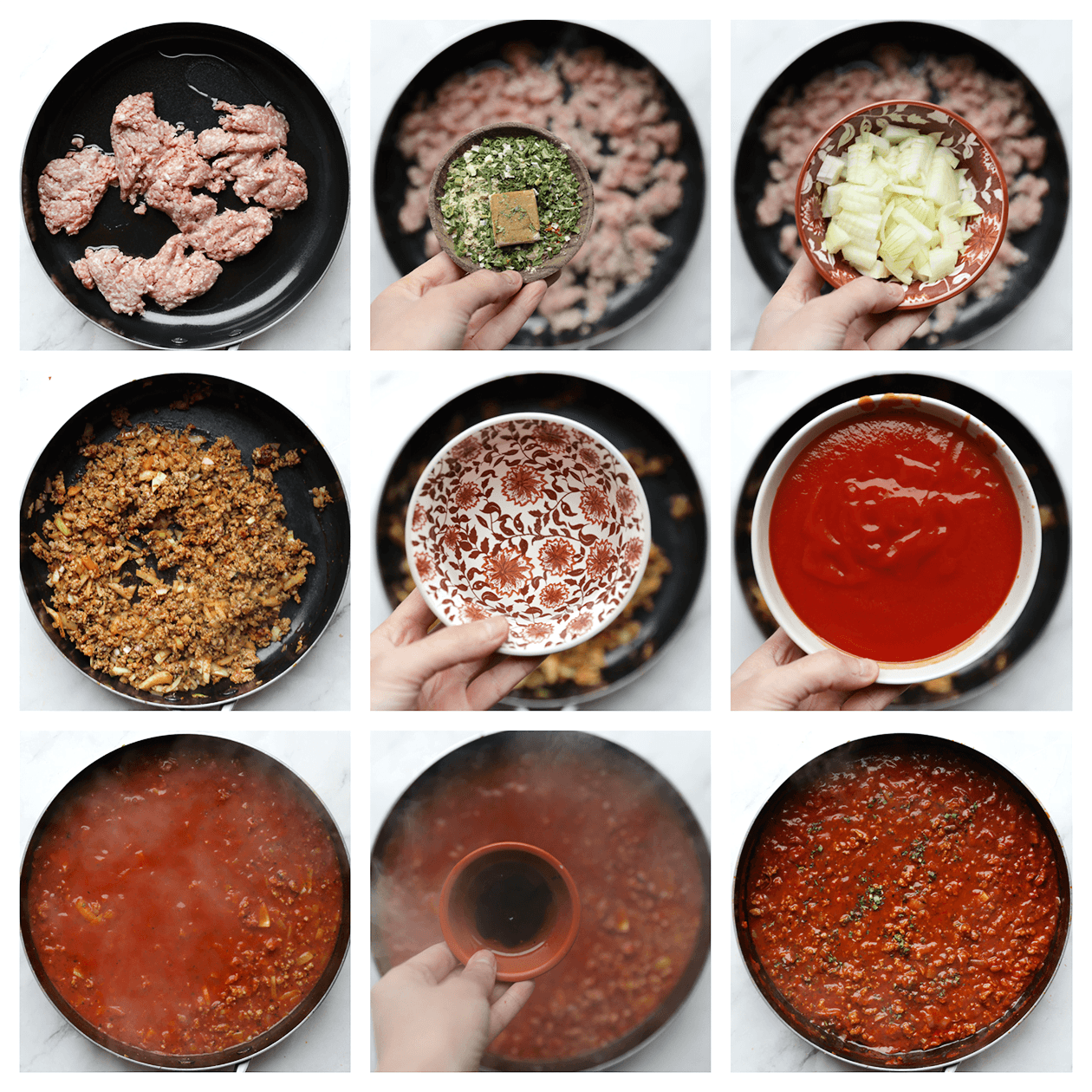 Verhit de olijfolie in een koekenpan op middelhoog vuur. Voeg het gehakt, knoflookpoeder, uienpoeder, de cayennepeper, paprikapoeder, Italiaanse kruiden, gedroogde peterselie toe, en verkruimel het runderbouillonblokje boven de pan. Voeg de gele ui toe en bak 6-7 minuten. Voeg de tomatensaus en het water toe. Meng goed en kook 4-5 minuten. Voeg als laatst de ketjap manis toe en meng goed tot een geheel. |