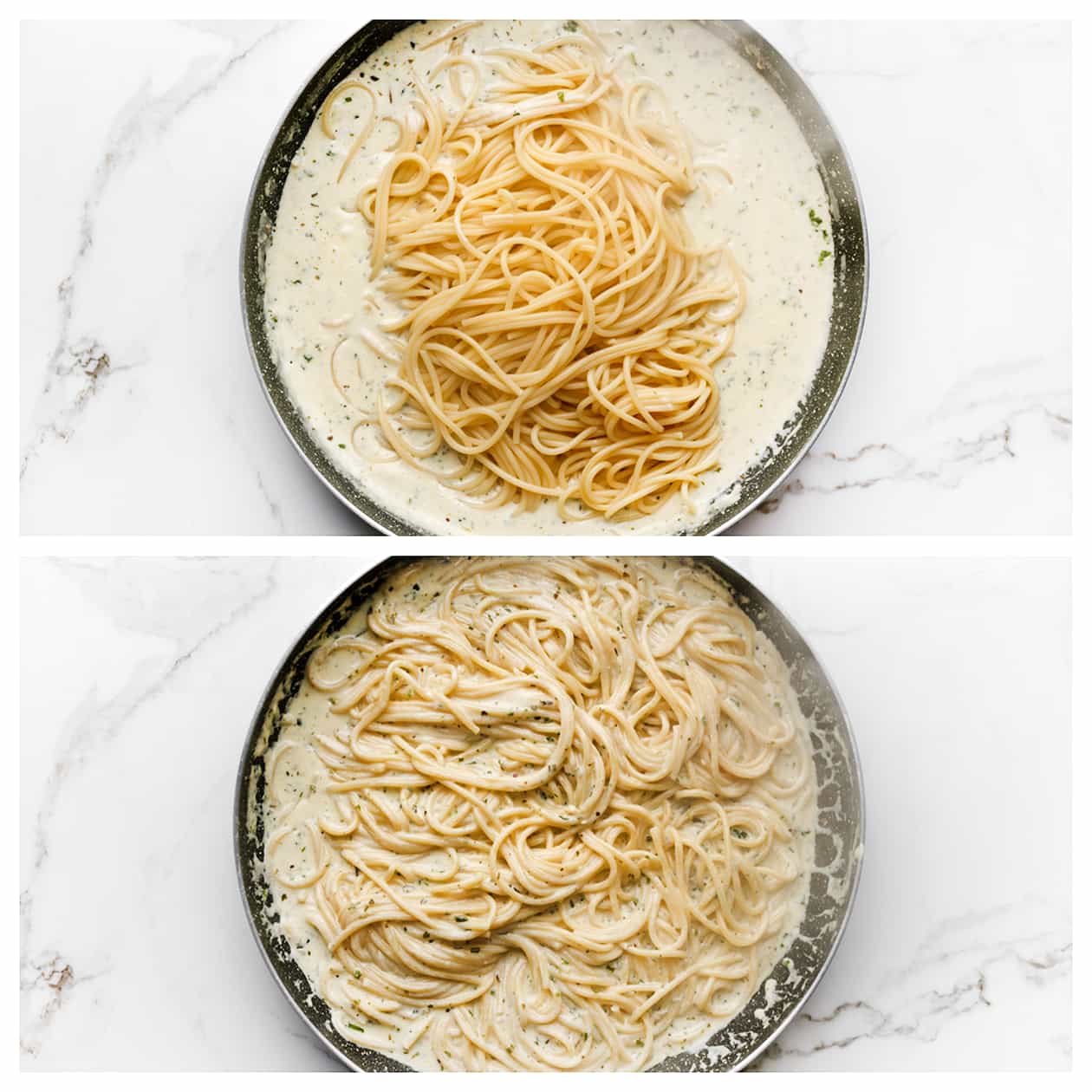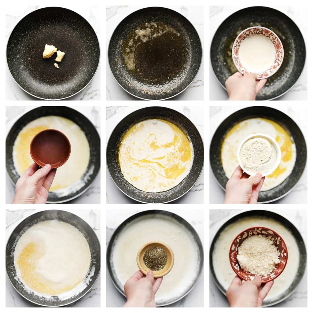 Verhit de roomboter in een koekenpan op middelhoog vuur. Voeg de ongeklopte slagroom en het pastawater toe. Laat enkele minuten koken. Voeg kruidenkaas met knoflook toe en laat de saus indikken. Meng zout, uienpoeder, zwarte peper, Italiaanse kruiden en gedroogde peterselie erdoor. Voeg als laatste Parmezaanse kaas toe en laat smelten. |