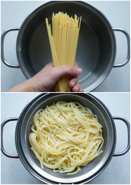 Breng een pan met ruim water aan de kook. Als het water begint te borrelen, voeg je eerst het zout toe en daarna de spaghetti. Wanneer de spaghetti is ingezakt, roer je het goed samen. Kook de spaghetti zo'n 11 tot 14 minuten. Doe de spaghetti in de vergiet en laat het water uitlekken.