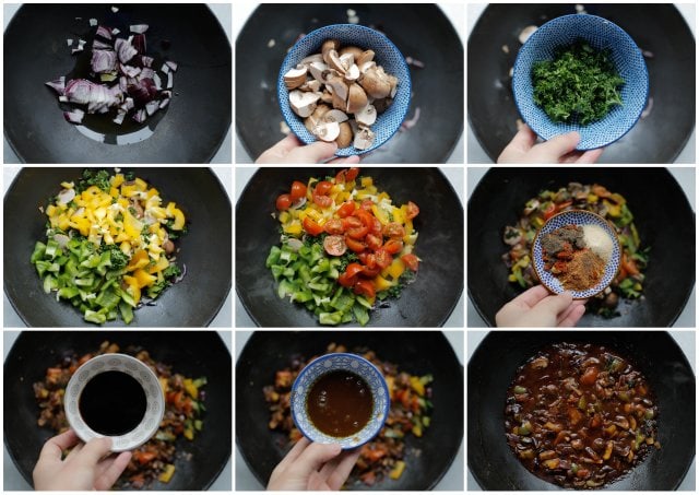 Verhit de olijfolie in de pan. Voeg de ui toe en bak het voor 2/3 minuten. Voeg de champignons, peterselie, paprika en snoeptomaatjes toe. Roerbak de groentes voor een paar minuten. Voeg de paprikapoeder, knoflookpoeder, zwarte peper, bami kruiden, groentebouillon, ketjap manis en curry saus toe. Roerbak alles samen voor een aantal minuten.
