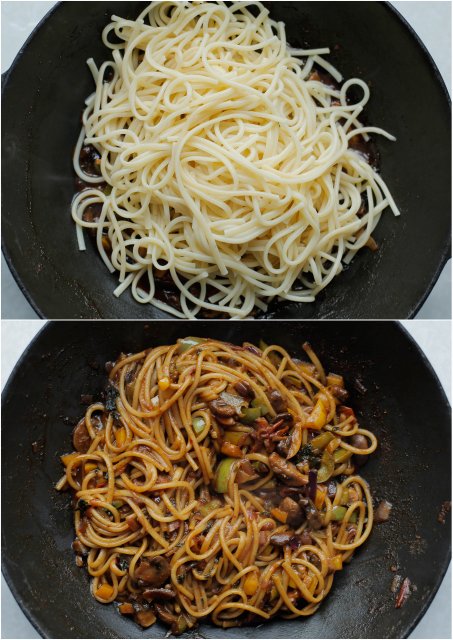 Voeg de spaghetti toe en wok het mee tot een geheel.