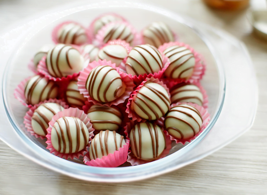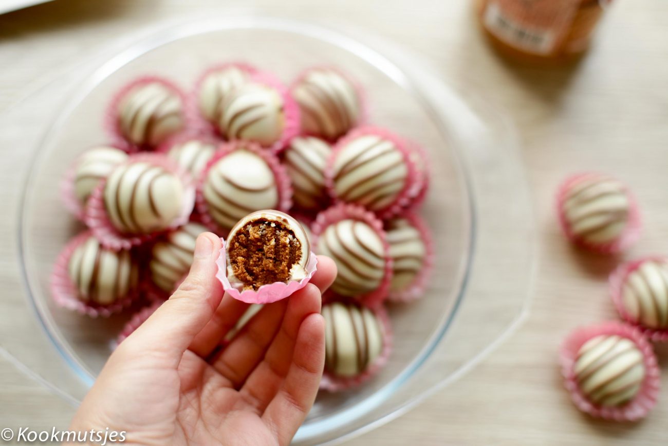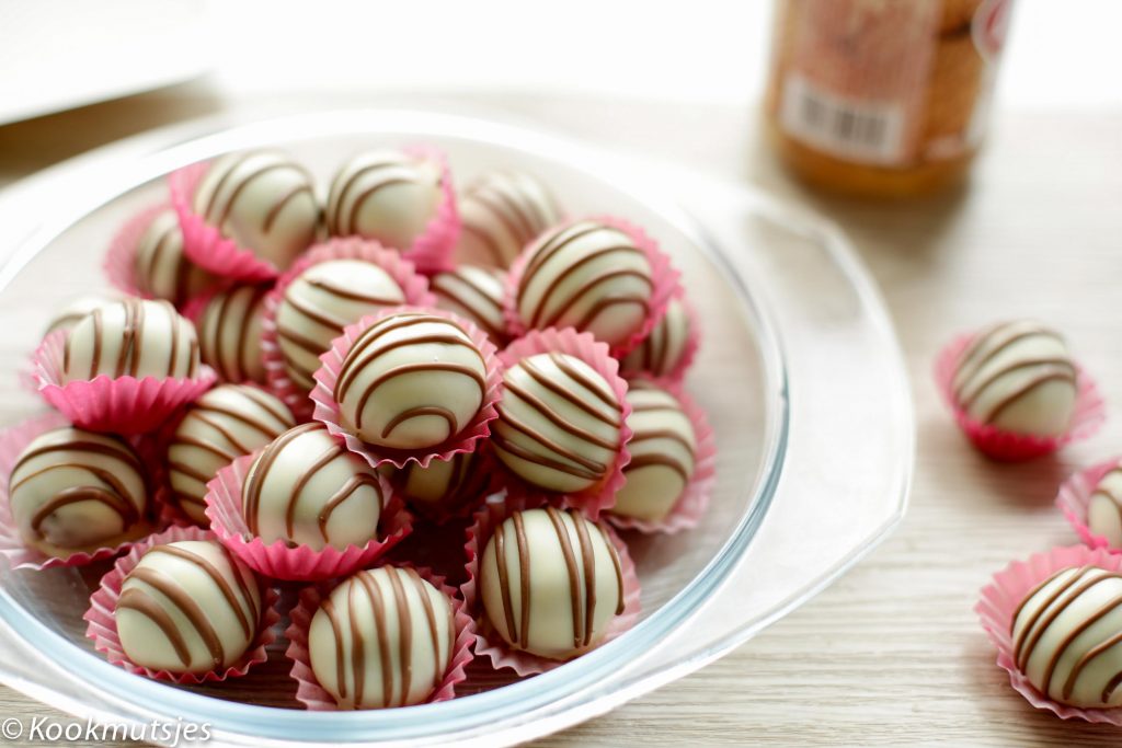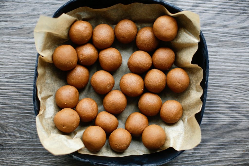 Vorm er bollen van (15 gr per stuk). Het kan zijn dat de bollen nog een beetje zacht zijn en de ronde vorm niet mooi is. Tip: Leg de bollen in de vriezer voor een half uur en rol ze opnieuw zodat ze mooi rond worden.