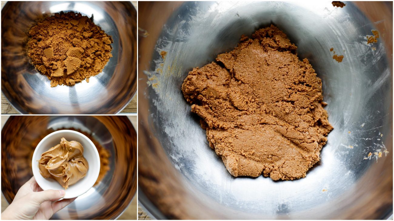 Doe de gemalen Speculoos koek in een diepe kom. Voeg de speculoospasta toe en meng het samen tot een geheel.