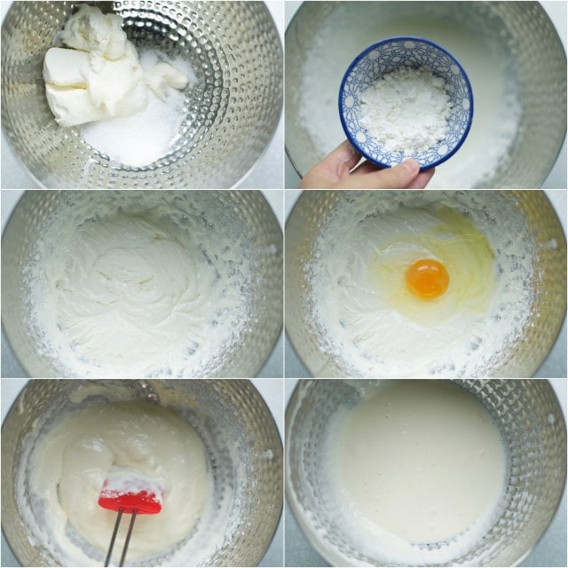 Doe de roomkaas samen met de zure room in een diepe kom. Mix voor een minuut. Voeg de suiker, vanillesuiker, het zout en de maïzena toe. Mix een minuut. Leg de mixer weg en gebruik vanaf nu de spatel. Los de eieren één voor één luchtig op met de spatel (doe dit niet met een mixer, want dan klop je het beslag op). |