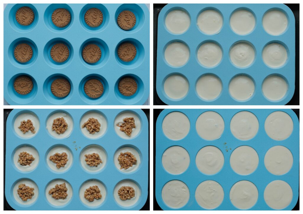 Giet de speculoos over de mini cheesecakes. Leg de cheesecakes terug in de koelkast om stevig te worden. |