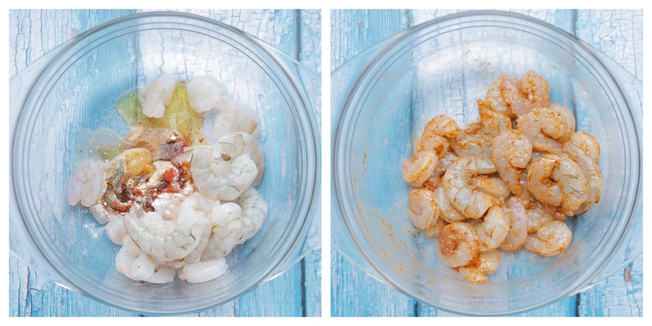 Doe de garnalen in een kom. Voeg de uienpoeder, knoflookpoeder, zwarte peper, het zout, de paprikapoeder en olijfolie toe. Meng goed.