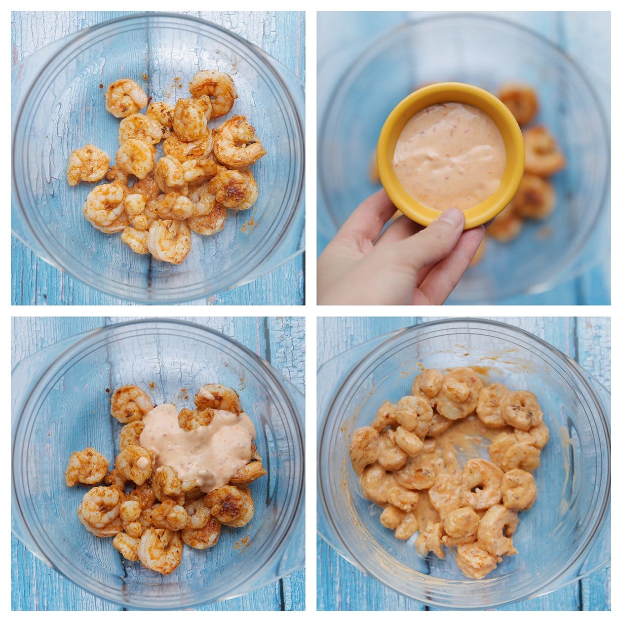 Doe de gebakken garnalen in een kom en voeg de saus toe (50 g). Meng tot een geheel.