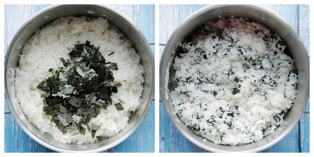 Knip de norivellen klein en voeg toe aan het rijstmengsel. Meng goed.