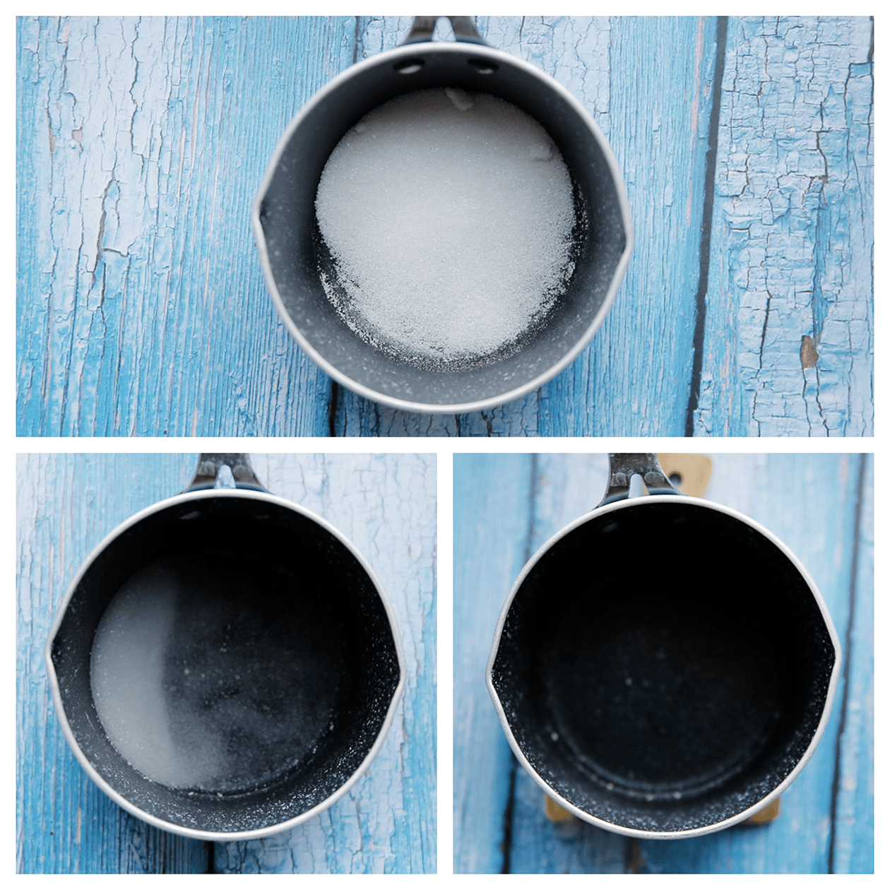 Kook de azijn samen met de suiker in een steelpan. Wanneer de suiker is opgelost, zet je het vuur uit. Laat de siroop op kamertemperatuur komen.