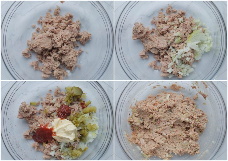 Snijd de ui en augurk klein. Laat de olie van de tonijn uitlekken. |