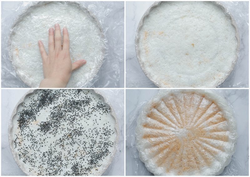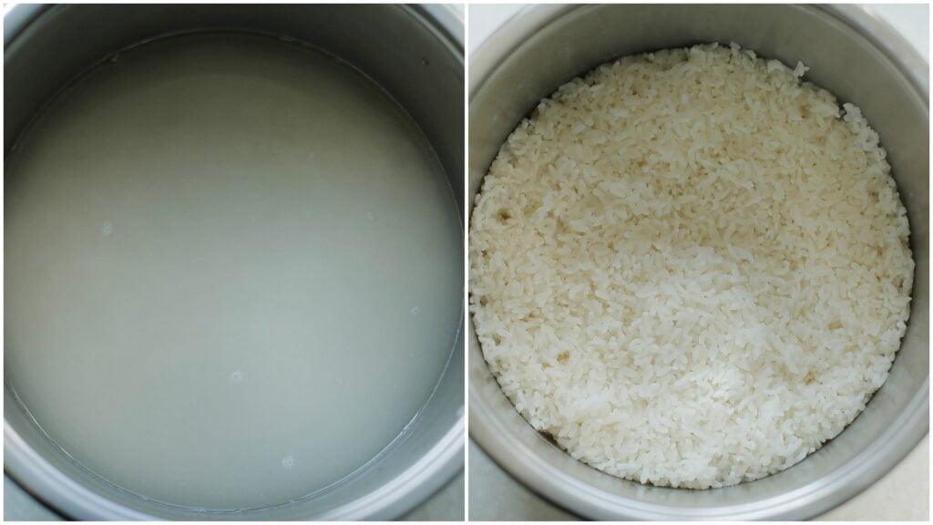 Was de rijst goed of tot het water helder is. Doe de rijst in een pan met dikke bodem en voeg het water en zout toe. Leg de deksel erop en kook het op hoog vuur. Zodra het water begint te schuimen, zet je het vuur op z’n laagst en laat je het verder koken voor zo’n 15 minuten. Zet het vuur uit en verwijder de deksel niet. Laat de pan met rijst even rusten en op kamertemperatuur komen. |