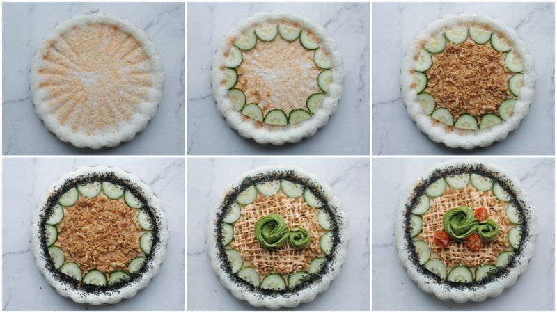 Snijd de komkommer en avocado in plakjes. Snijd de surimi in reepjes. |