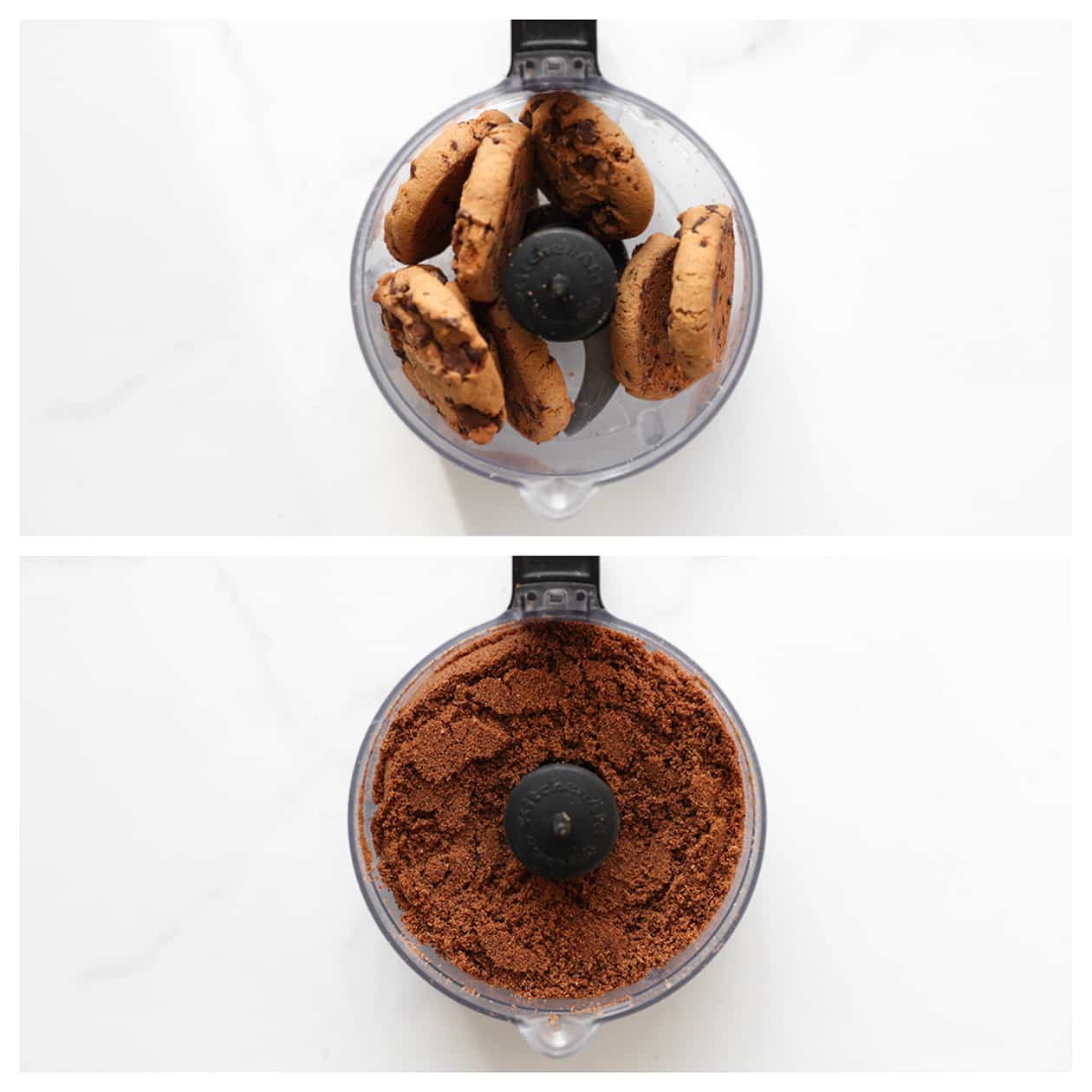 Maal de chocolate chip cookies fijn in een hakmolen.