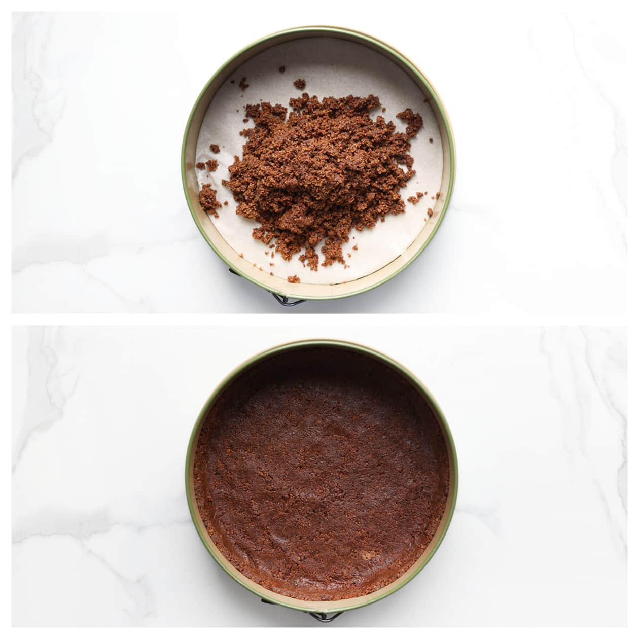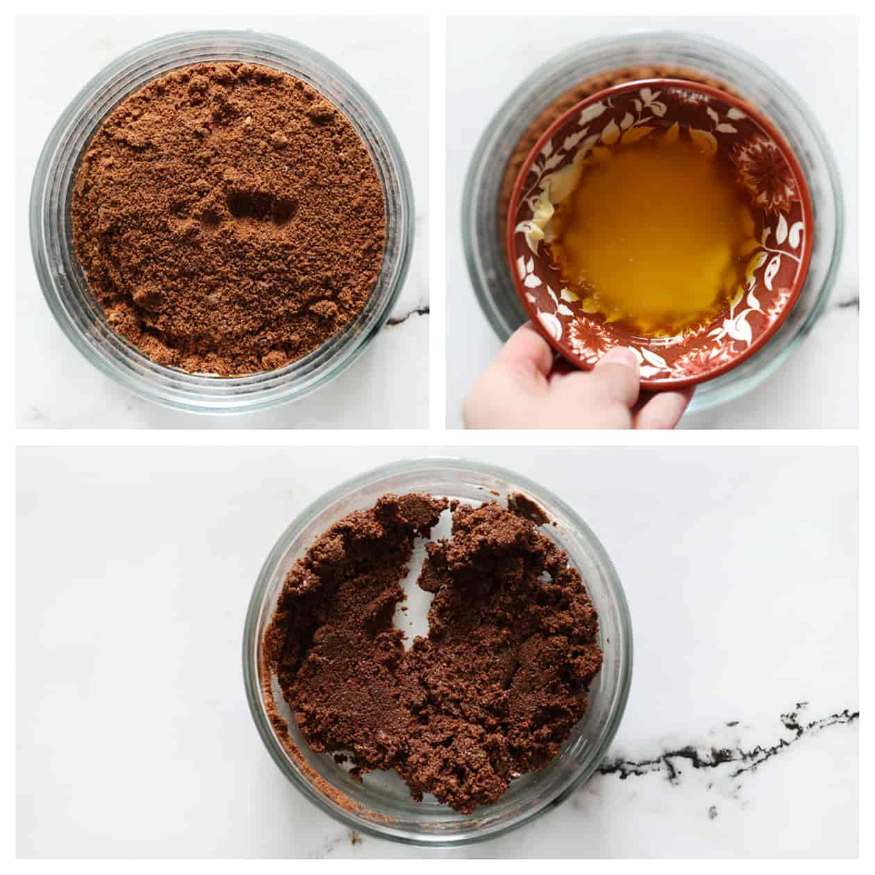 Doe de fijngemalen cookies in een diepe kom en voeg de gesmolten roomboter toe. Meng goed tot een geheel.
