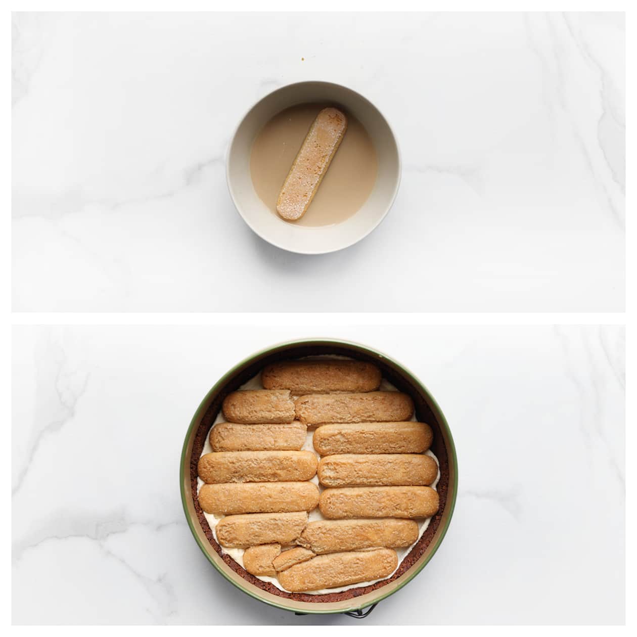 Doop de lange vingers kort in de koude koffie (koffie naar wens) en verdeel ze over de roomlaag.