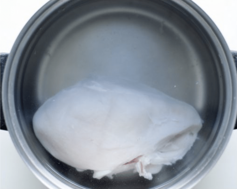 Kook de kipfilet in ruim water met een beetje zout. Wanneer de kipfilet gaar is (de kip moet wit van kleur zijn), haal je de pan van het vuur. Giet het water af en laat de kipfilet iets afkoelen.