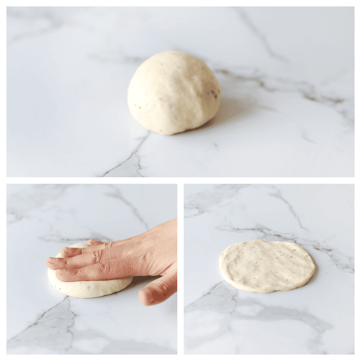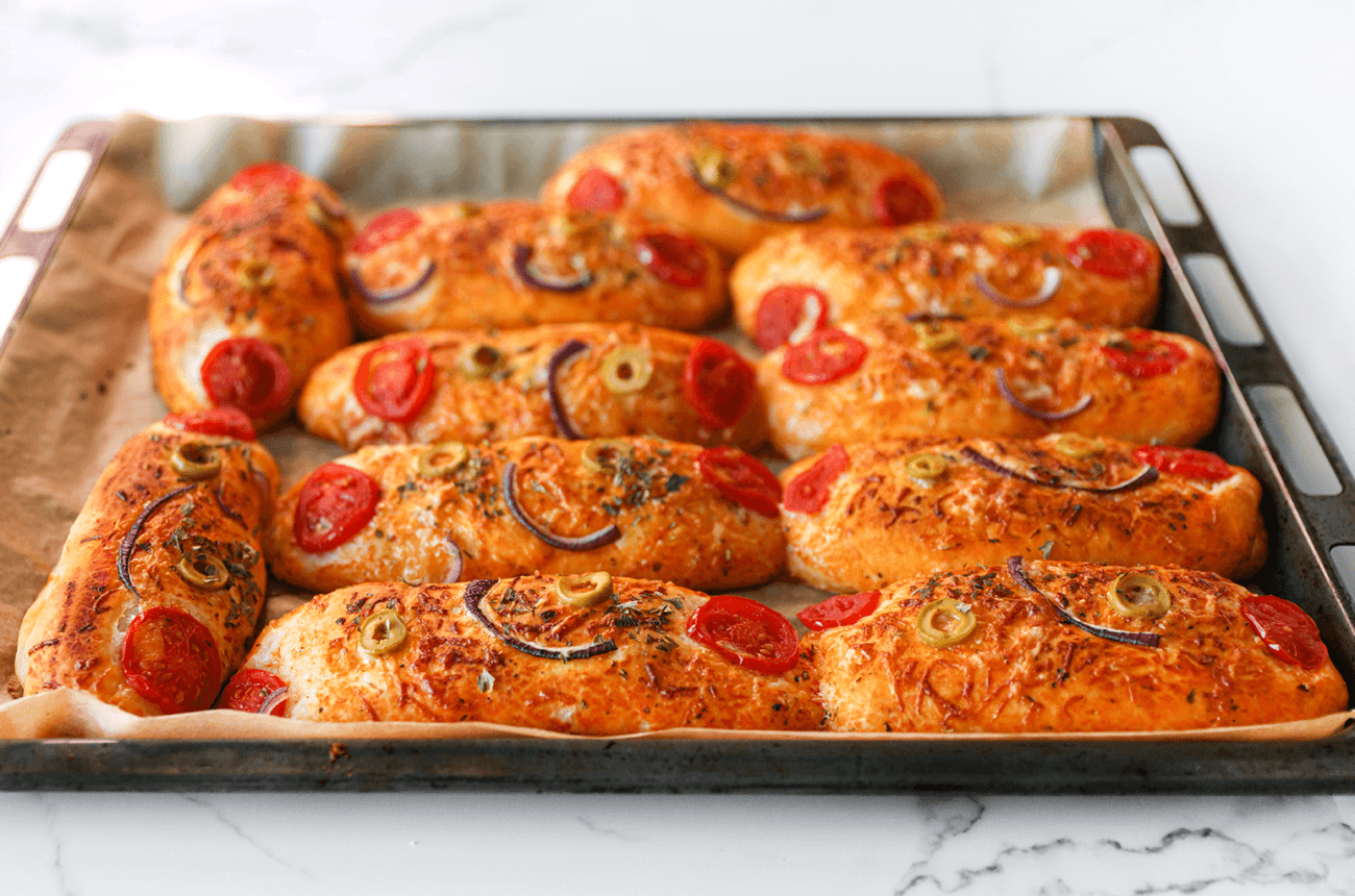 Doe de bloem samen met de gist, suiker en het zout in een diepe kom. Maak een gat in het midden en vul dit met Italiaanse kruiden, zonnebloemolie, yoghurt en het lauwwarme water. Meng alles goed door elkaar en kneed het deeg 10-12 minuten tot het mooi glad en elastisch is.