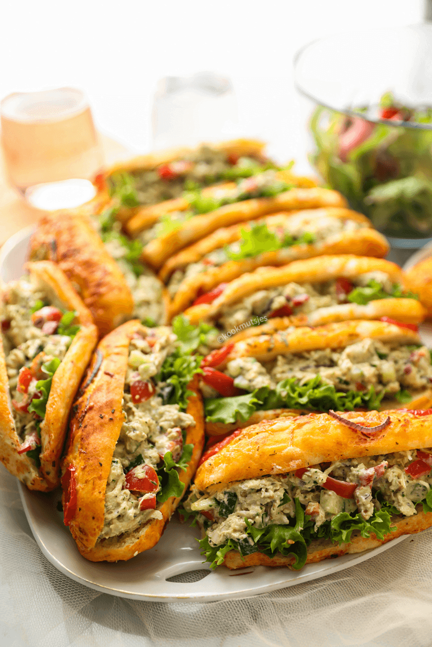 Deze zachte, huisgemaakte broodjes zijn heerlijk gevuld met een smaakvolle kipsalade! De salade bevat een combinatie van kip en verse groenten, die perfect samengaan met het zachte broodje! Je zult er keer op keer van willen genieten! Gewoonweg een top combinatie!