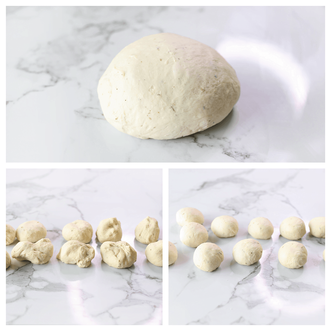 Verdeel het deeg in 11 stukken van ongeveer 68/70 gram per stuk en maak er bollen van.