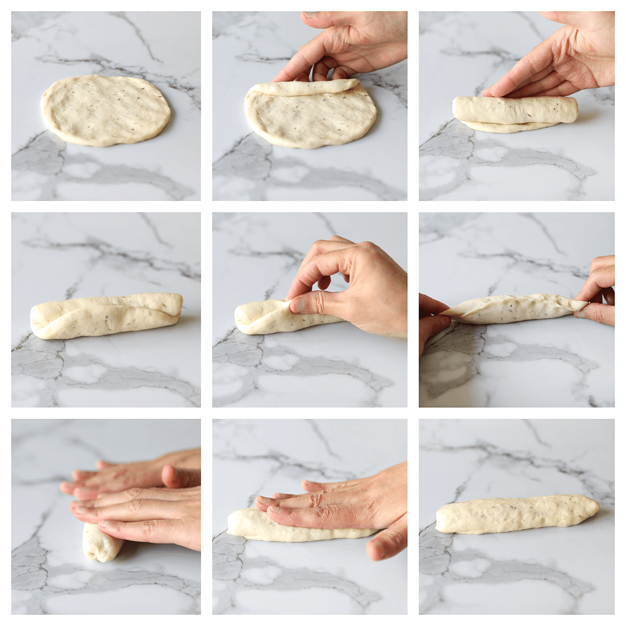 Rol het deeg dan op tot een staaf van 14 cm. Knijp het uiteinde goed dicht en druk het deeg iets plat.