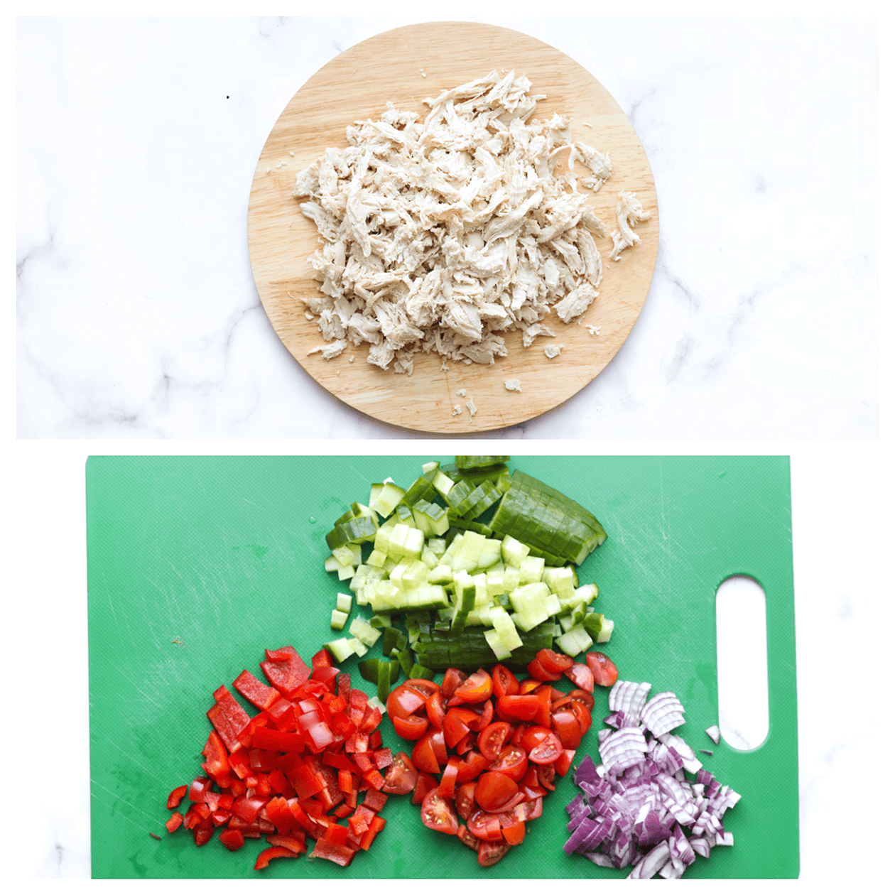 Pluk of snijd de kipfilet in stukjes. Snijd de rode ui, rode paprika, snoeptomaatjes en komkommer klein.