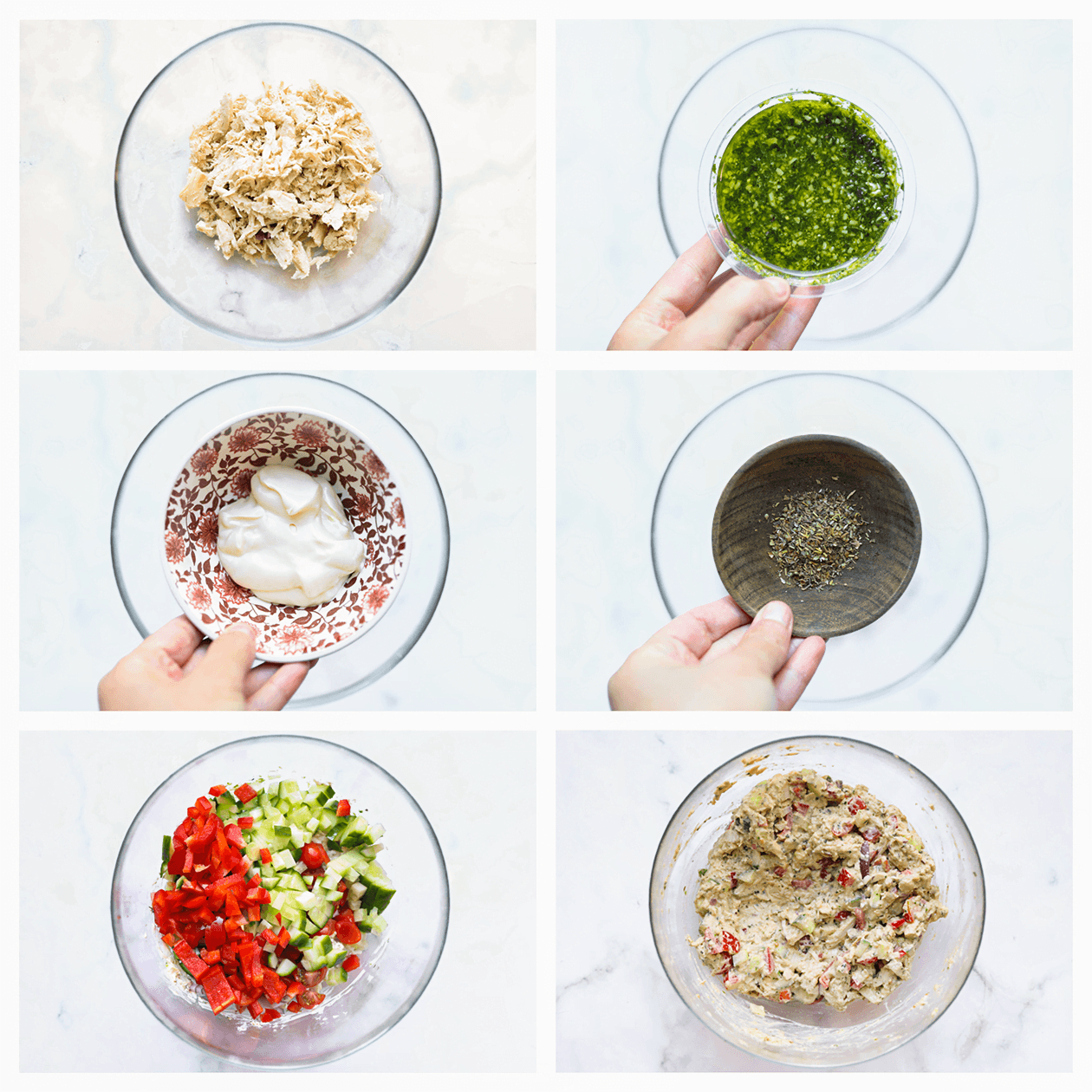 Doe de geplukte kip in een diepe kom. Voeg de groene pesto, mayonaise en Italiaanse kruiden toe en meng alles goed door elkaar. Voeg de rode ui, rode paprika, snoeptomaatjes en komkommer toe en meng opnieuw tot een geheel. Voeg zout en peper toe naar smaak.