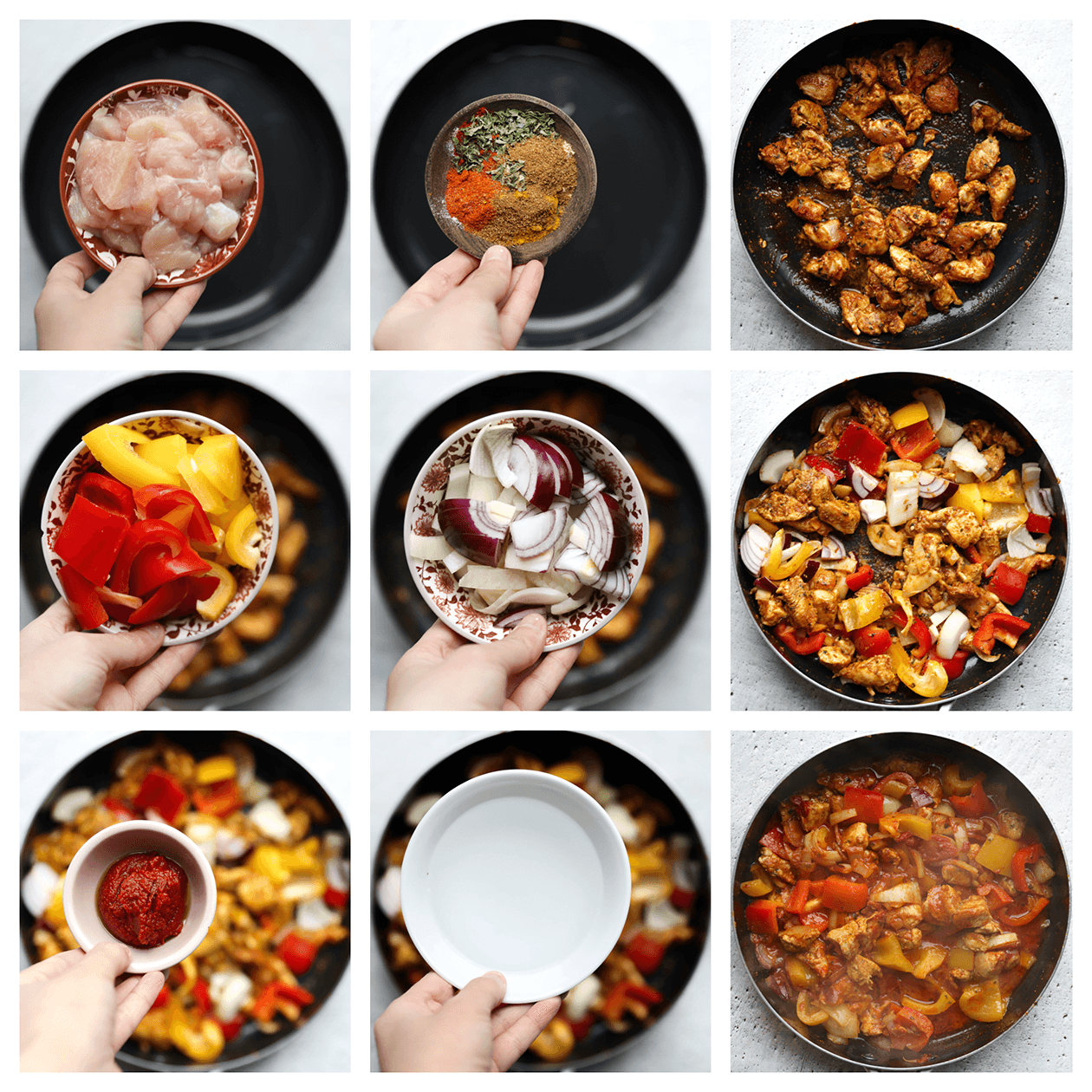 Was en snijd de kip in stukken. Verhit de zonnebloemolie in een koekenpan op middelhoog vuur. Voeg de kip, kipkruiden, komijnpoeder, paprikapoeder, knoflookpoeder, uienpoeder en zwarte peper toe. Bak gedurende 3-4 minuten. Voeg de rode paprika, gele paprika, gele ui en rode ui toe. Bak nog 4 minuten. Voeg de tomatenpuree, het water en zout toe. Kook gedurende 12-15 minuten. |