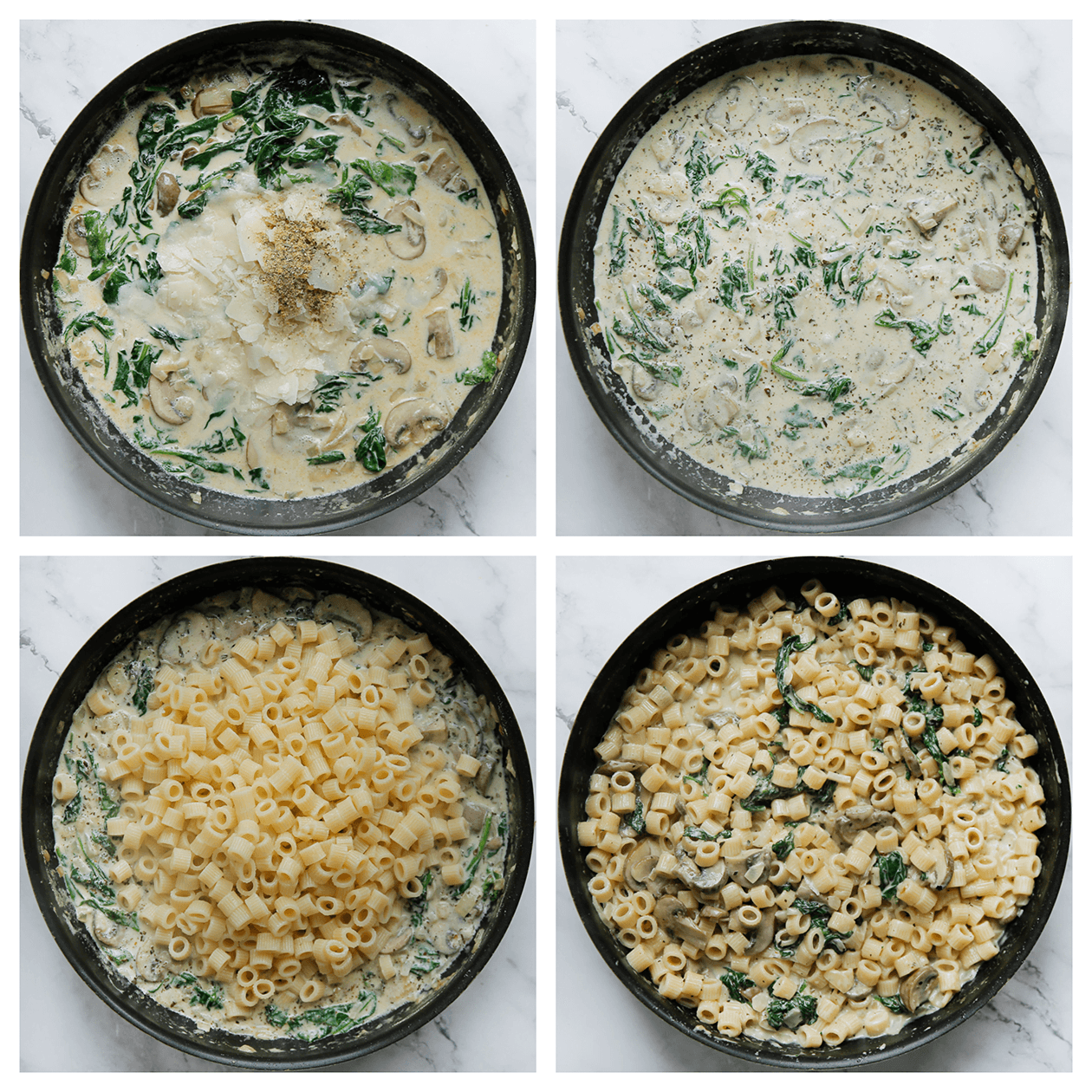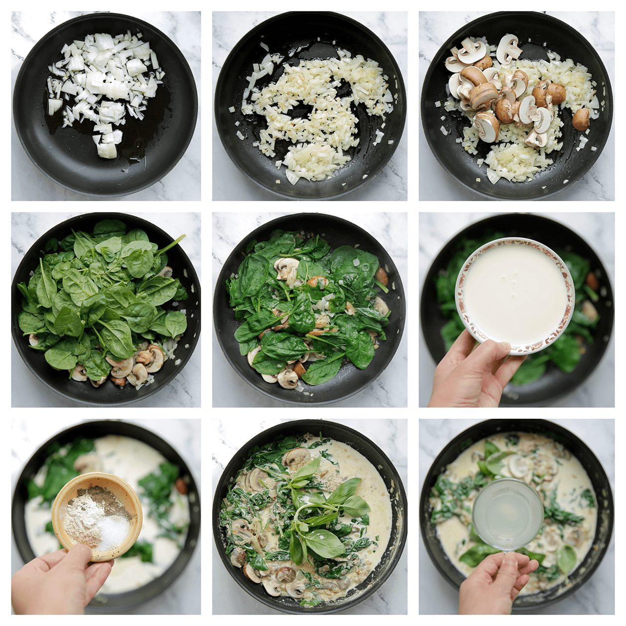 Verhit de olijfolie in een koekenpan op middelhoog vuur. Voeg de gele ui toe en bak 3-4 minuten. Voeg de kastanjechampignons toe en spinazie toe. Bak 2 minuten. Voeg de ongeklopte slagroom, knoflookpoeder, uienpoeder, de zwarte peper, het zout en pastawater toe. Kook tot een geheel. Voeg de basilicum toe. Meng goed. |