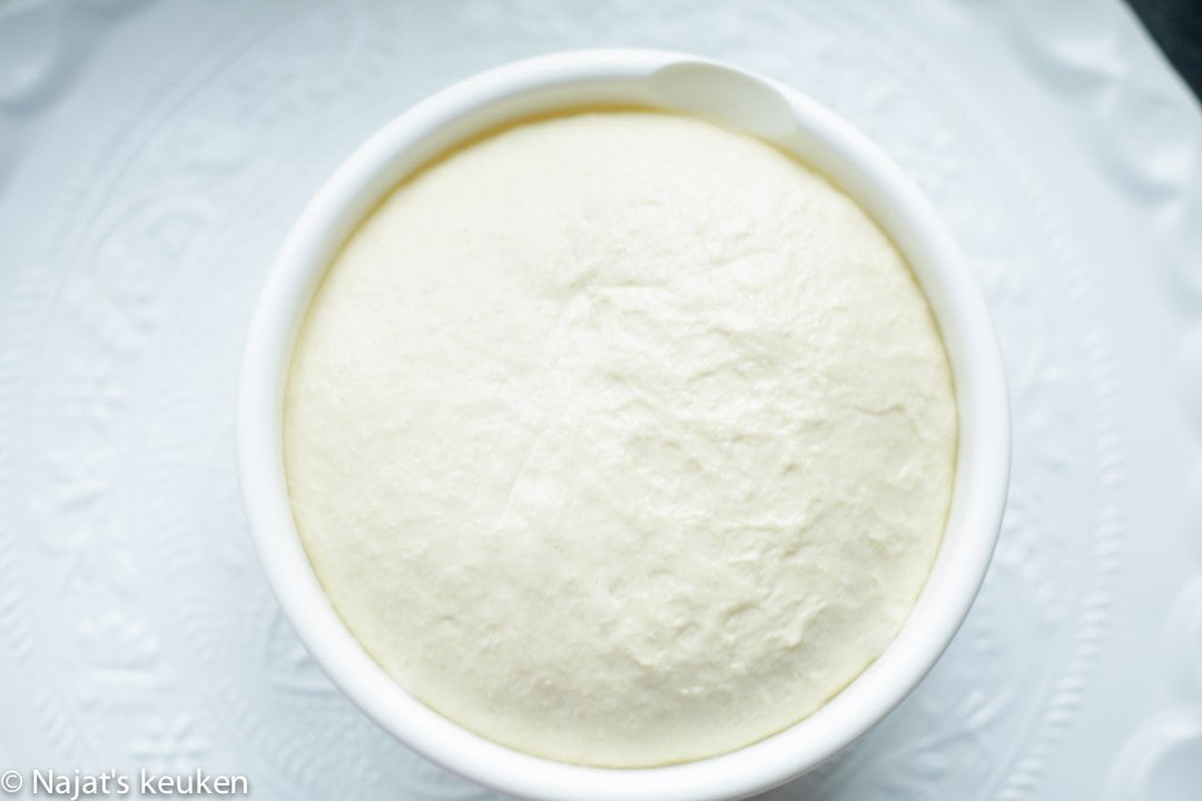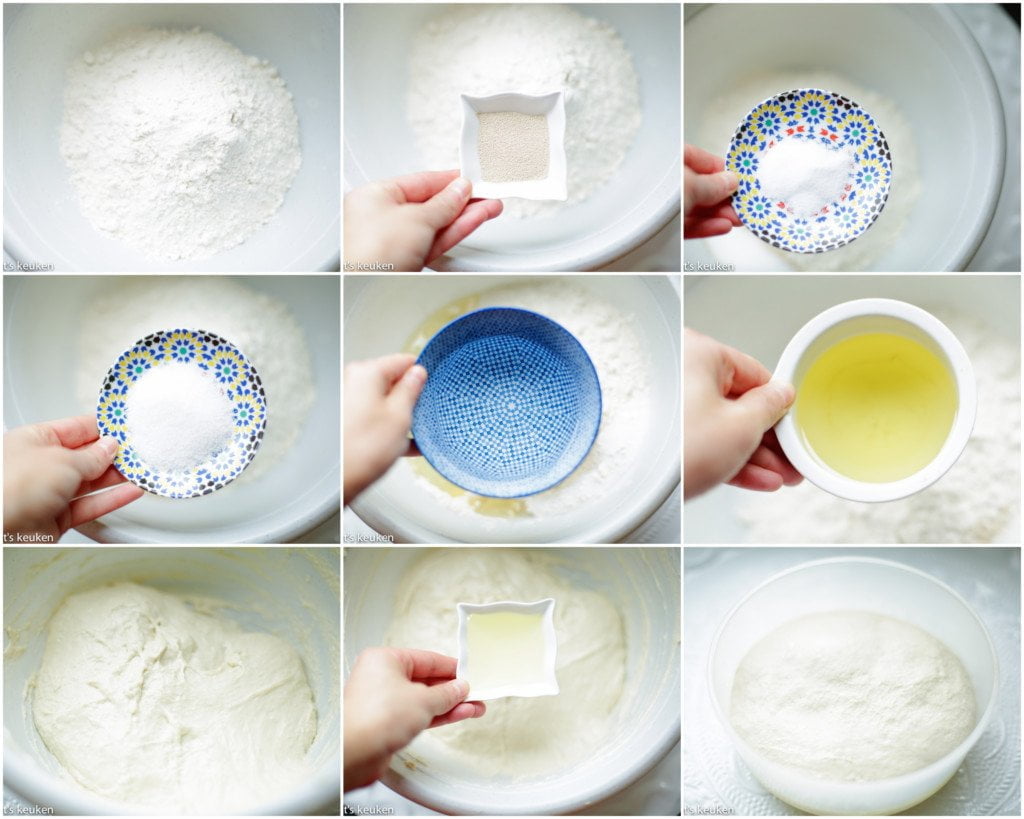 Voeg de bloem in een kom samen met de gist, zout, suiker, zonnebloemolie en yoghurt, meng samen tot een geheel en voeg dan de water toe. Meng/kneed alles zo’n 10 tot 12 minuten. Het deeg is erg plakkerig, daarom voeg je op het eind de extra 15 ml zonnebloemolie toe en kneed samen voor een minuut. Door de zonnebloemolie kan je het deeg vormen tot een geheel. |
