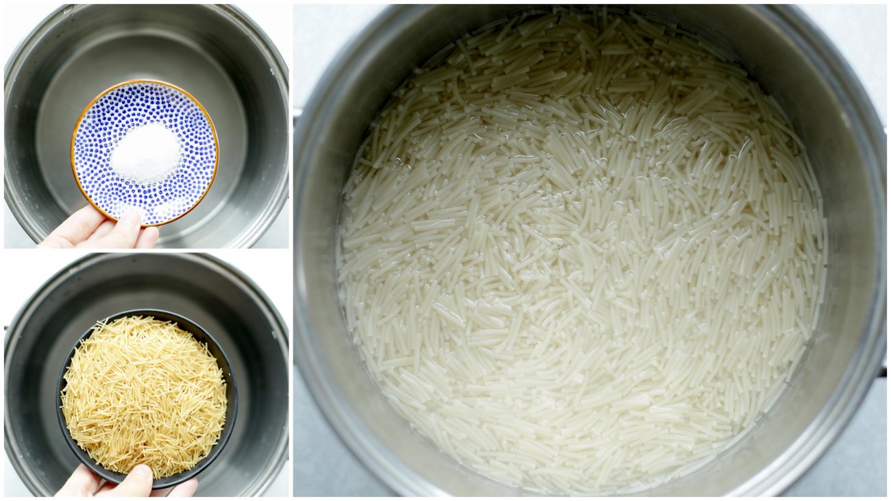 Breng één liter water aan de kook. Als het begint te borrelen, voeg je het zout en vermicelli toe. Roer het los van elkaar. Kook voor zo’n 8 minuten.