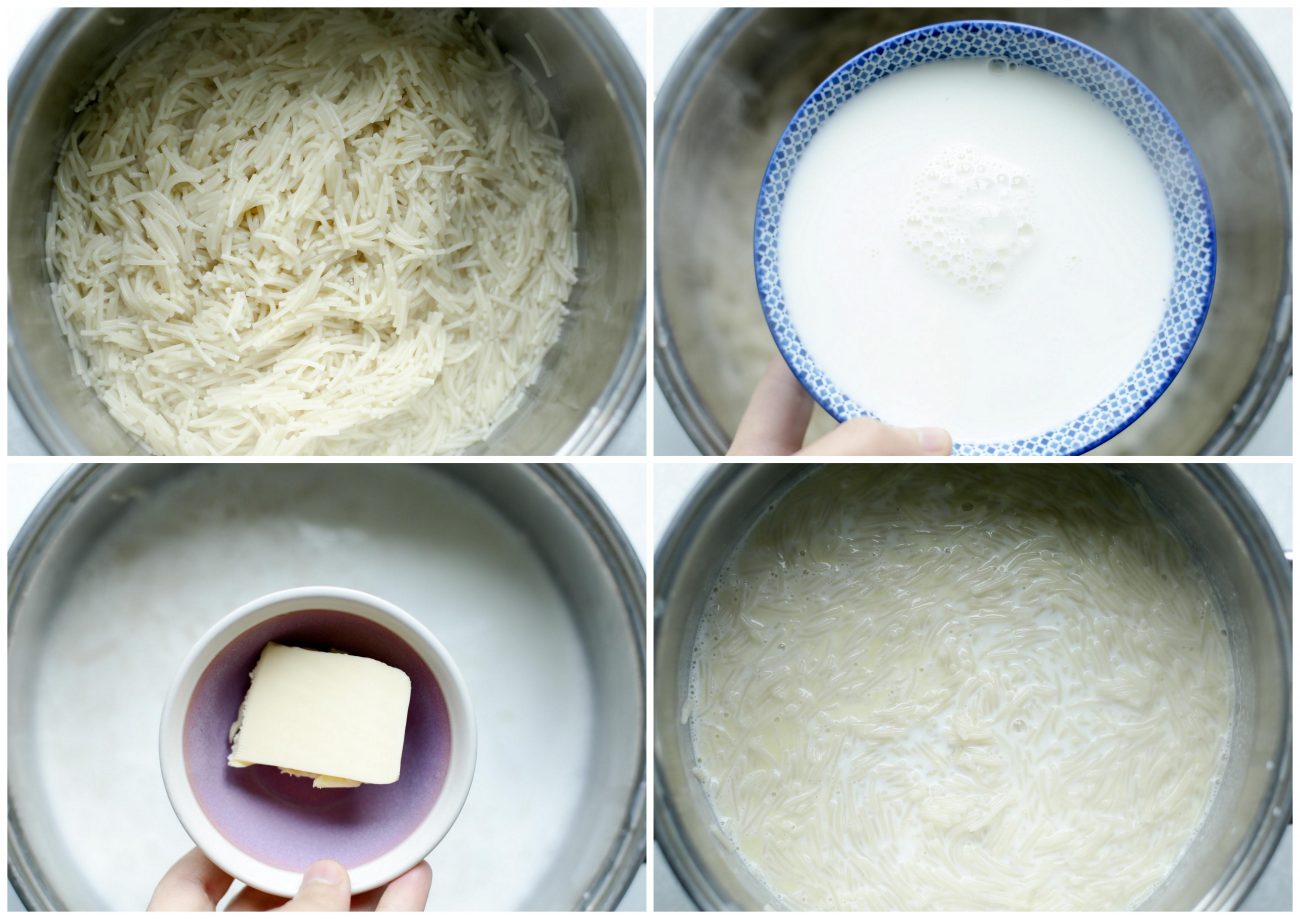 Doe de vermicelli weer terug in de pan. Voeg de melk en roomboter toe. Kook het weer samen voor een paar minuten en voeg zout toe naar smaak.