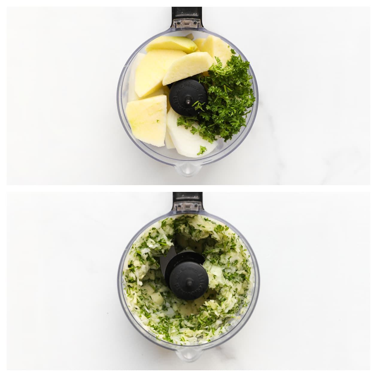 Schil en snijd de appel in stukken. Pel en snijd de gele ui in stukken. Doe de appel, gele ui en de verse peterselie in een hakmolen en maal tot een fijn mengsel.