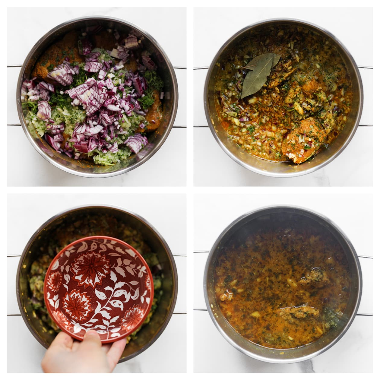 Voeg de gesnipperde rode ui en het appelmengsel toe aan de pan. Bak 4-5 minuten, zodat de smaken vrijkomen. Voeg de laurierblaadjes en het water toe. Zet het vuur hoog totdat het mengsel begint te pruttelen. Verlaag vervolgens het vuur en laat het 60 minuten zachtjes koken met de deksel op de pan.