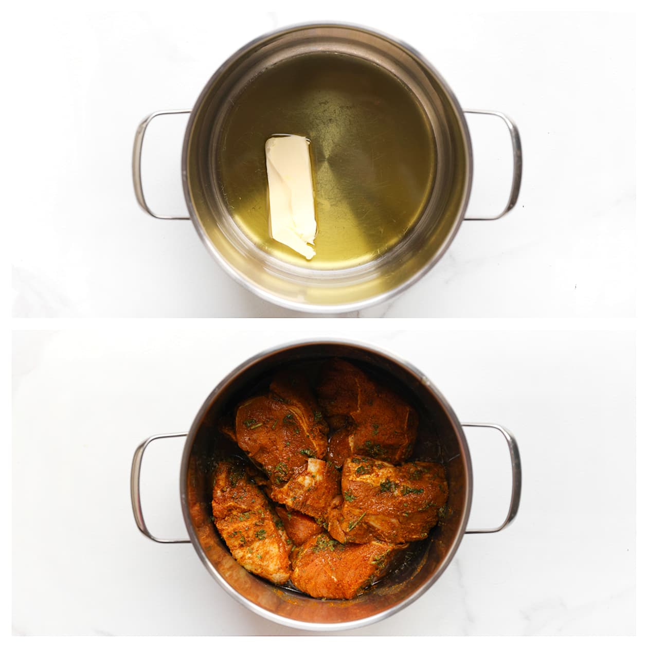 Verhit de roomboter en olijfolie in een diepe pan op middelhoog vuur. Voeg het vlees toe en bak het rondom bruin.