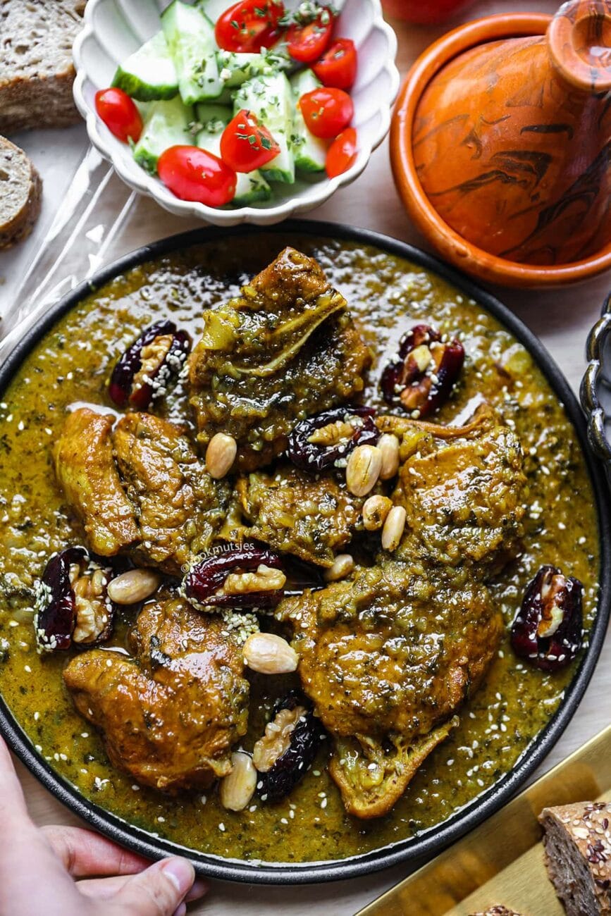Schik het vlees in het midden van een grote schaal, giet de saus erover en leg de dadels, walnoten en amandelen decoratief langs de zijkanten en het midden.