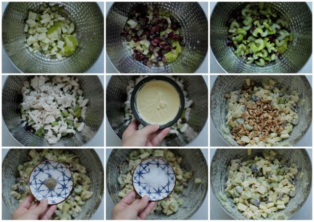 Snijd de druiven, appel, bleekselderij en walnoten in stukjes. |