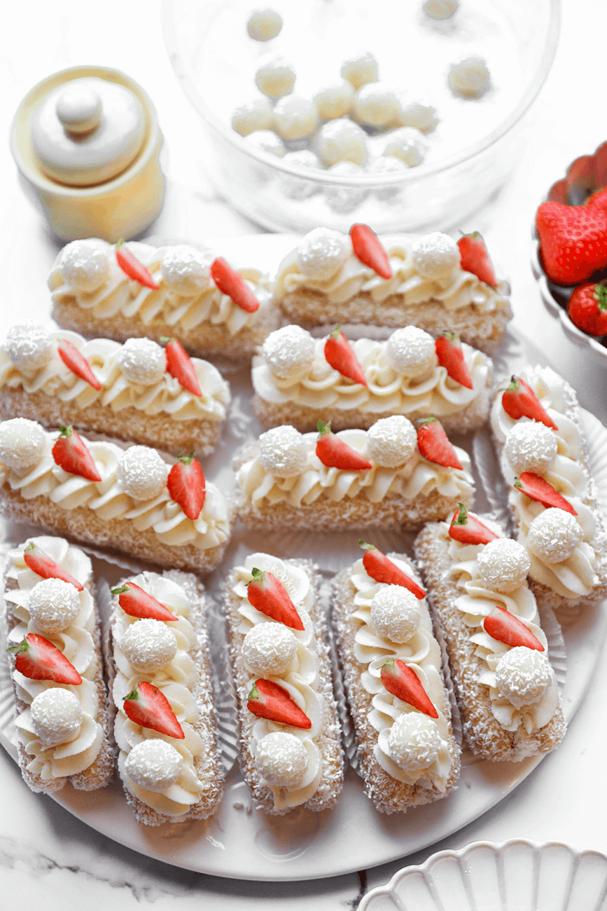 Looking for a no-bake treat that’s both easy and impressive? These white chocolate coconut desserts are a dreamy mix of creamy mascarpone, fluffy whipped cream, and a layer of ladyfingers, all rolled in coconut and topped with fresh strawberries. Perfect for when you want something sweet without turning on the oven! With a few simple ingredients like white chocolate spread and grated coconut, you’ll whip up these beautiful little bites that look like they came from a bakery. Get ready to wow your guests with this coconut and white chocolate delight that’s as delicious as it is easy to make!