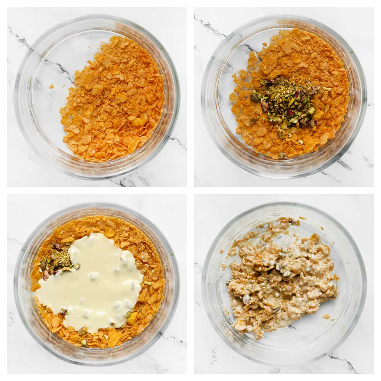 These white chocolate-pistachio bars with raspberries and cornflakes are seriously yummy! Imagine crunchy cornflakes mixed up with creamy white chocolate, jazzed up with the nuttiness of pistachios and a dash of sweet raspberry jam. They’re a snack that’s perfect for any time of day.